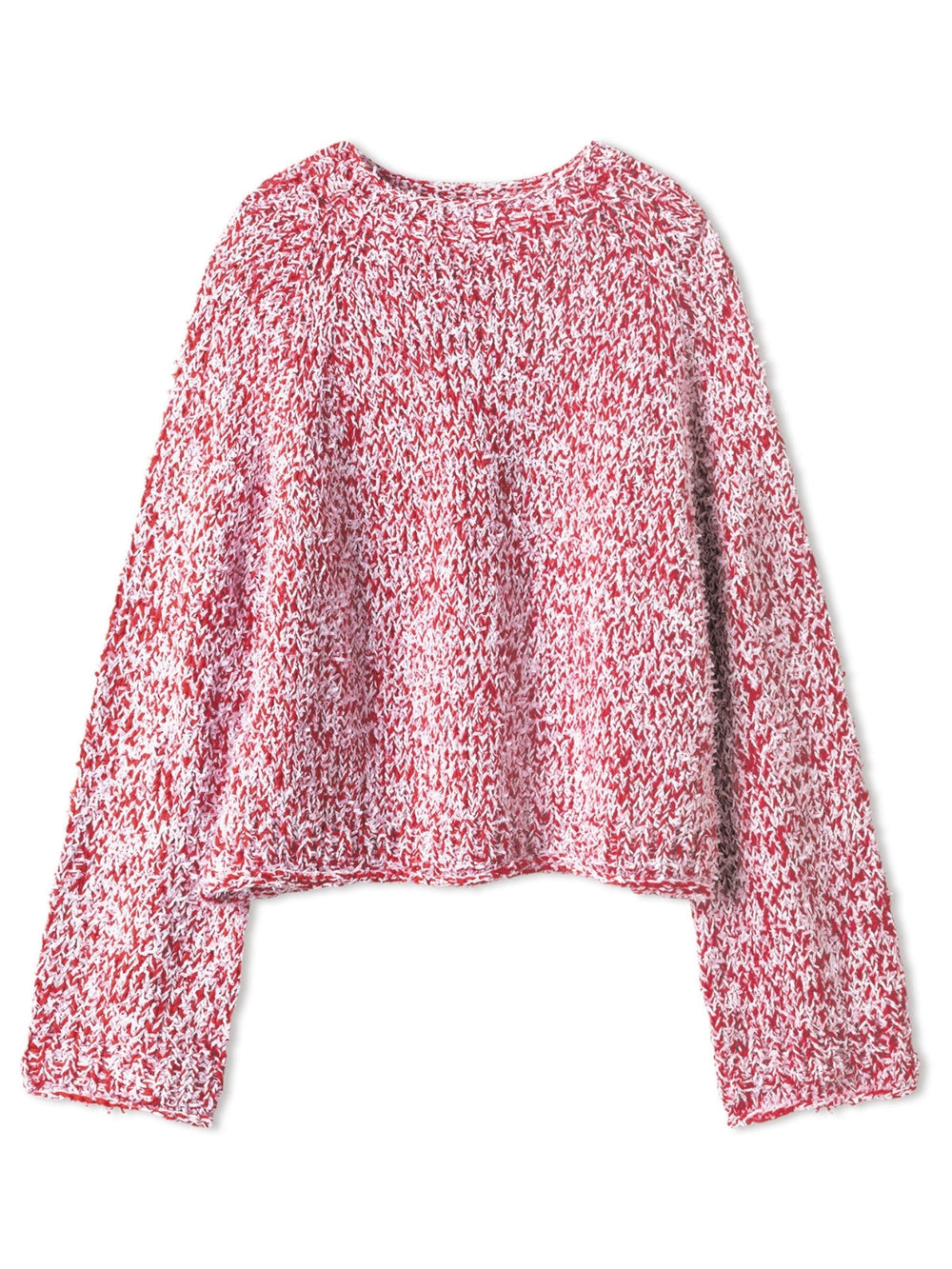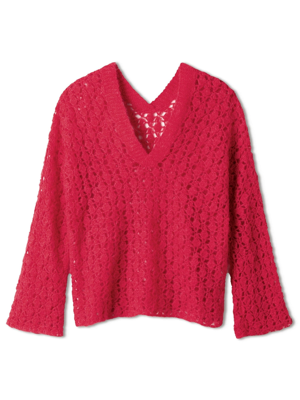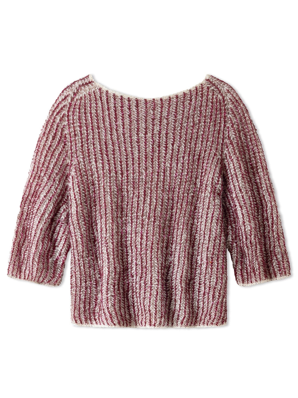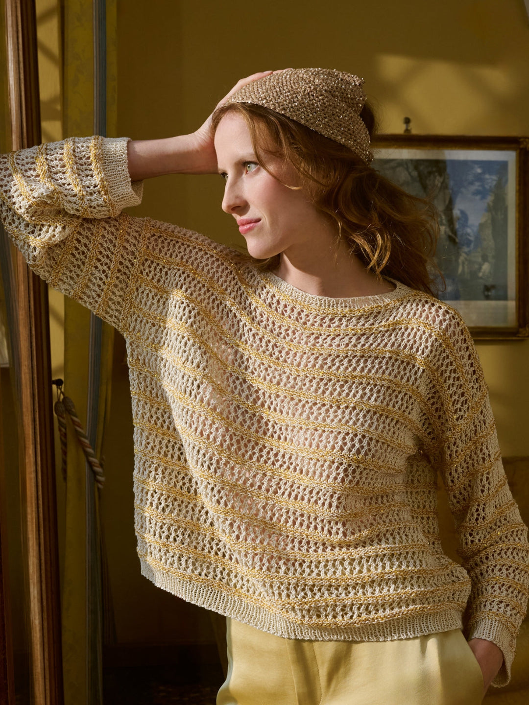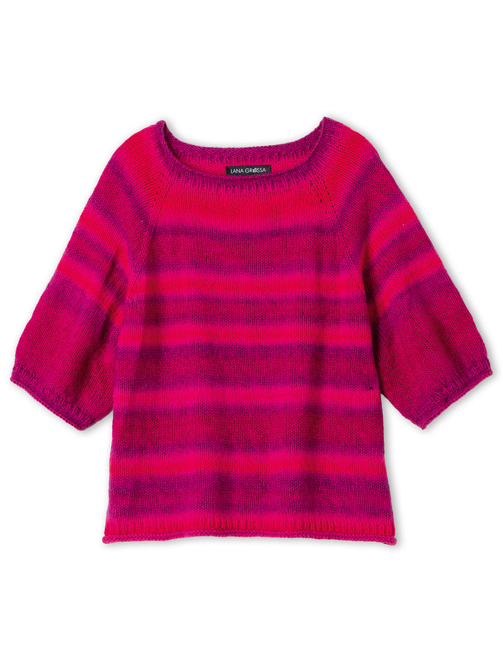 Die Wolle liegt angenehm in der Hand und lässt sich sehr gut verhäkeln. Es macht Freude zu sehen, wie in jeder Runde ein anderer Farbverlauf mit leichtem Glitzereffekt entsteht. Auf dem 1. Bild sieht man die Rückseite des Häkelstücks, die später die Vorderseite des Pullovers bildet, obwohl ich die Vorderseite mit dem dickeren Knötchenmuster ( 2. Bild ) auch sehr reizvoll finde.