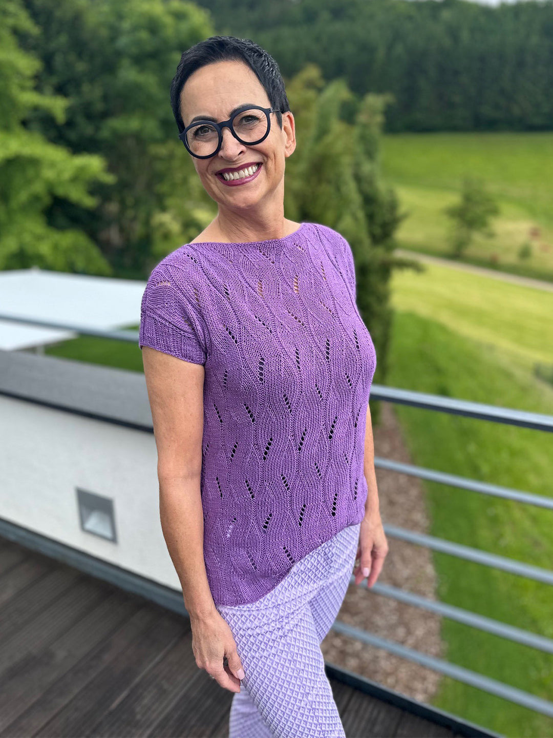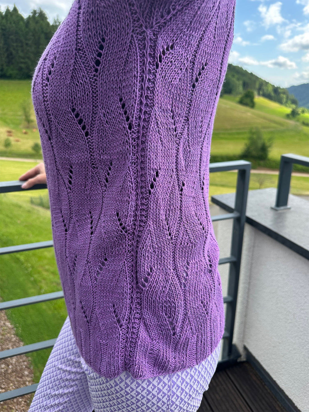 Dies war der erste Pullover, den ich in einem Stück von oben nach unten gestrickt habe. Die Ärmel rund zu stricken fand ich etwas mühsam, aber das Ergebnis gefällt mir und anderen sehr gut. Die Wolle läßt sich sehr gut verstricken, der Farbverlauf ist wunderschön. Sehr angenehm weiche Wolle. Sie scheint mir allerdings etwas empfindlich zu sein und ich hoffe, dass es nicht allzu sehr zu Flusenbildung kommt.