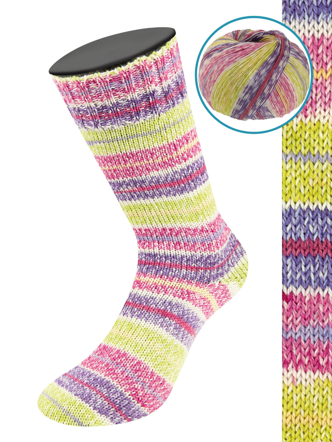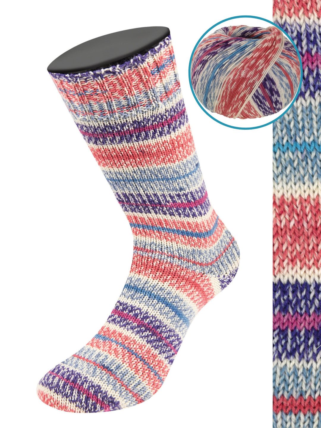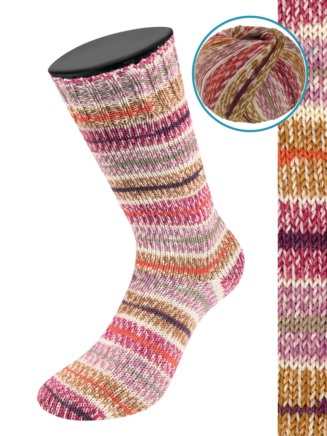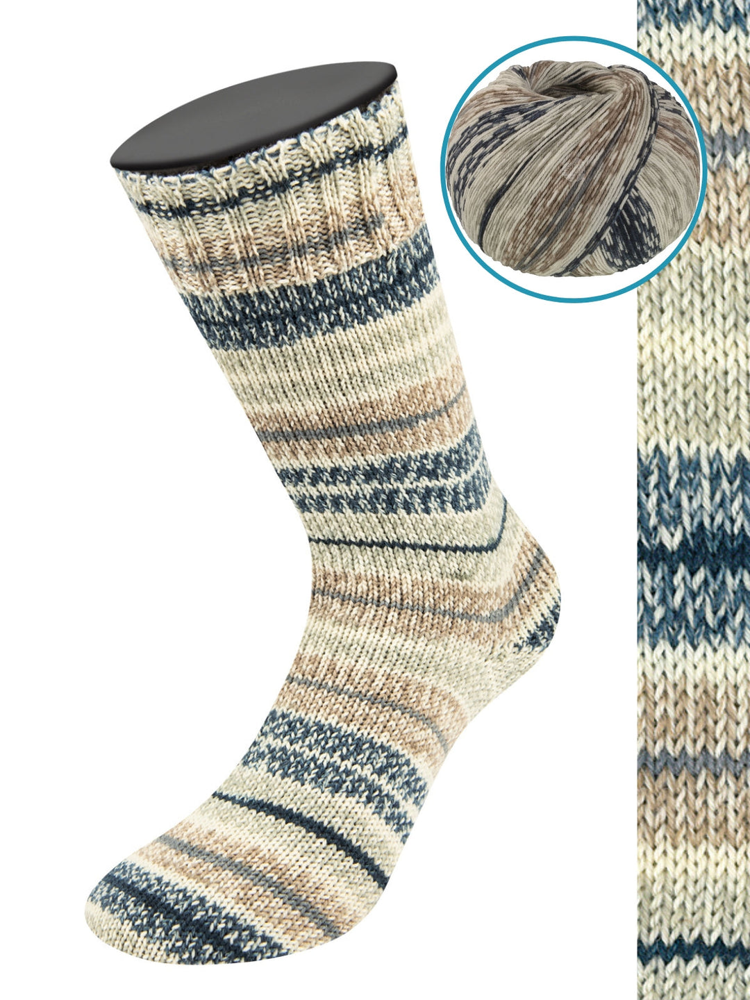 Meilenweit von Lana Grossa ist ein tolles Garn für Socken. Mit 70 % Wolle und 5 % Kaschmir sind die Socken angenehm und warm. Der Anteil von 25 % Polyamid sorgt für Strapazierfähigkeit. Ein Knäuel dieser wunderbaren Wolle reicht für ein Paar Socken (bis einschließlich Größe 46).