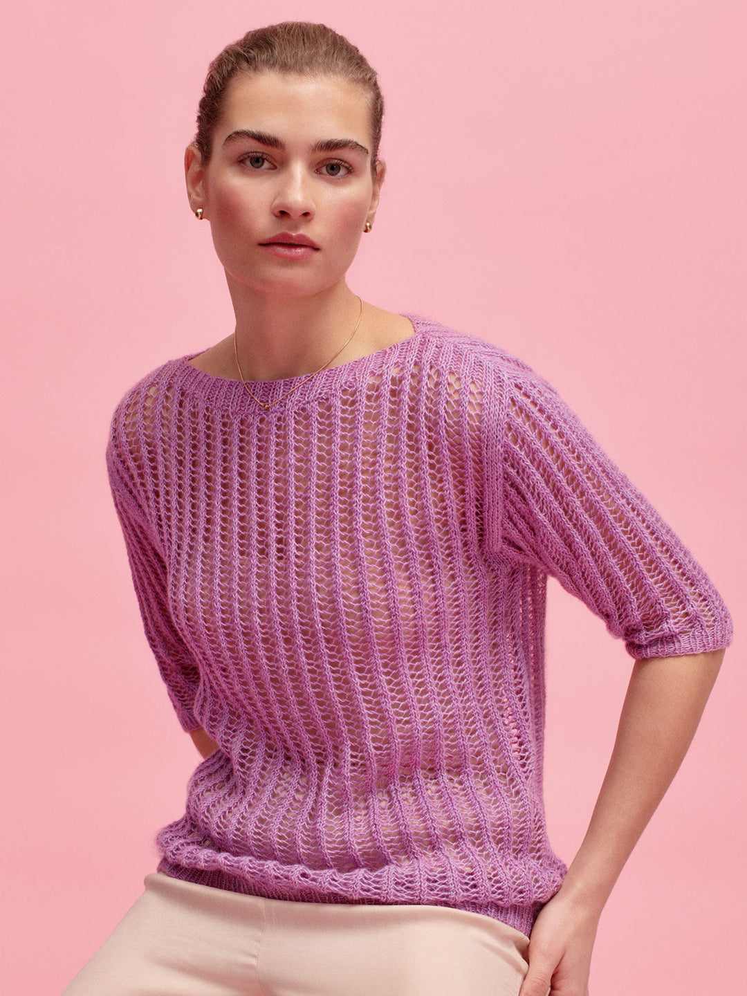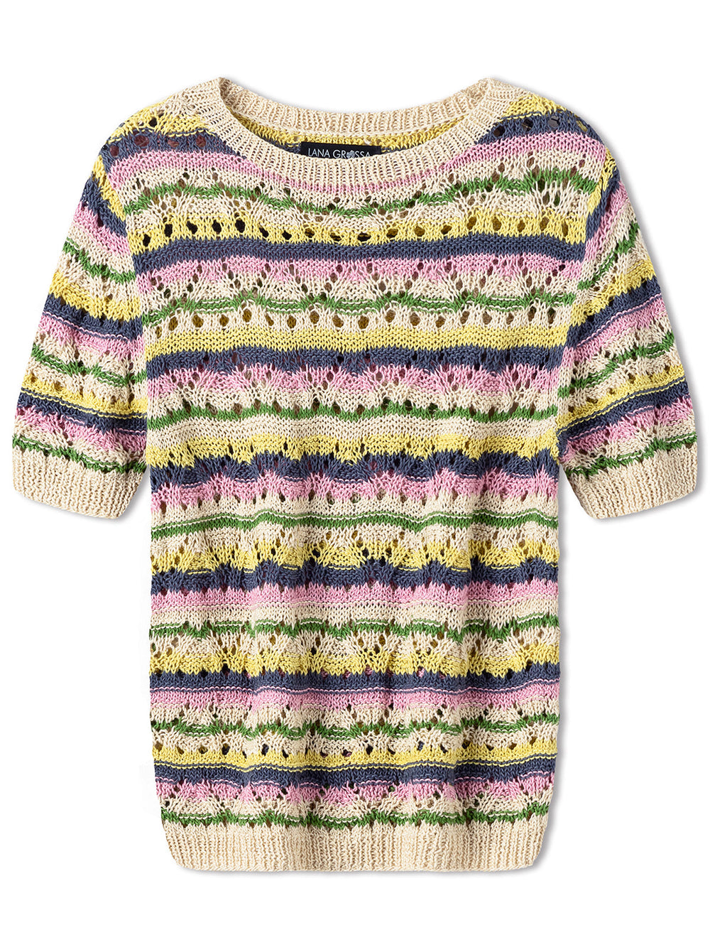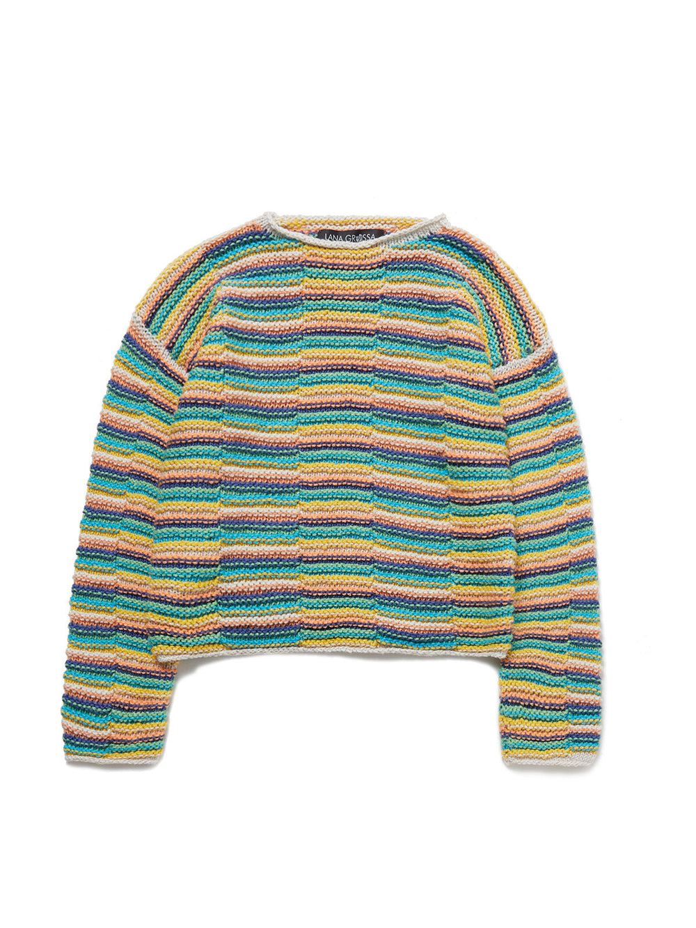 Dies war der erste Pullover, den ich in einem Stück von oben nach unten gestrickt habe. Die Ärmel rund zu stricken fand ich etwas mühsam, aber das Ergebnis gefällt mir und anderen sehr gut. Die Wolle läßt sich sehr gut verstricken, der Farbverlauf ist wunderschön. Sehr angenehm weiche Wolle. Sie scheint mir allerdings etwas empfindlich zu sein und ich hoffe, dass es nicht allzu sehr zu Flusenbildung kommt.