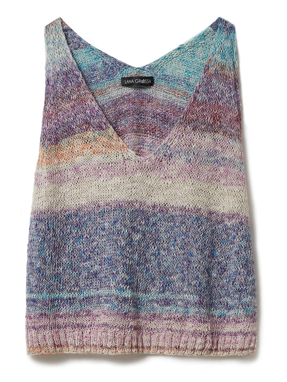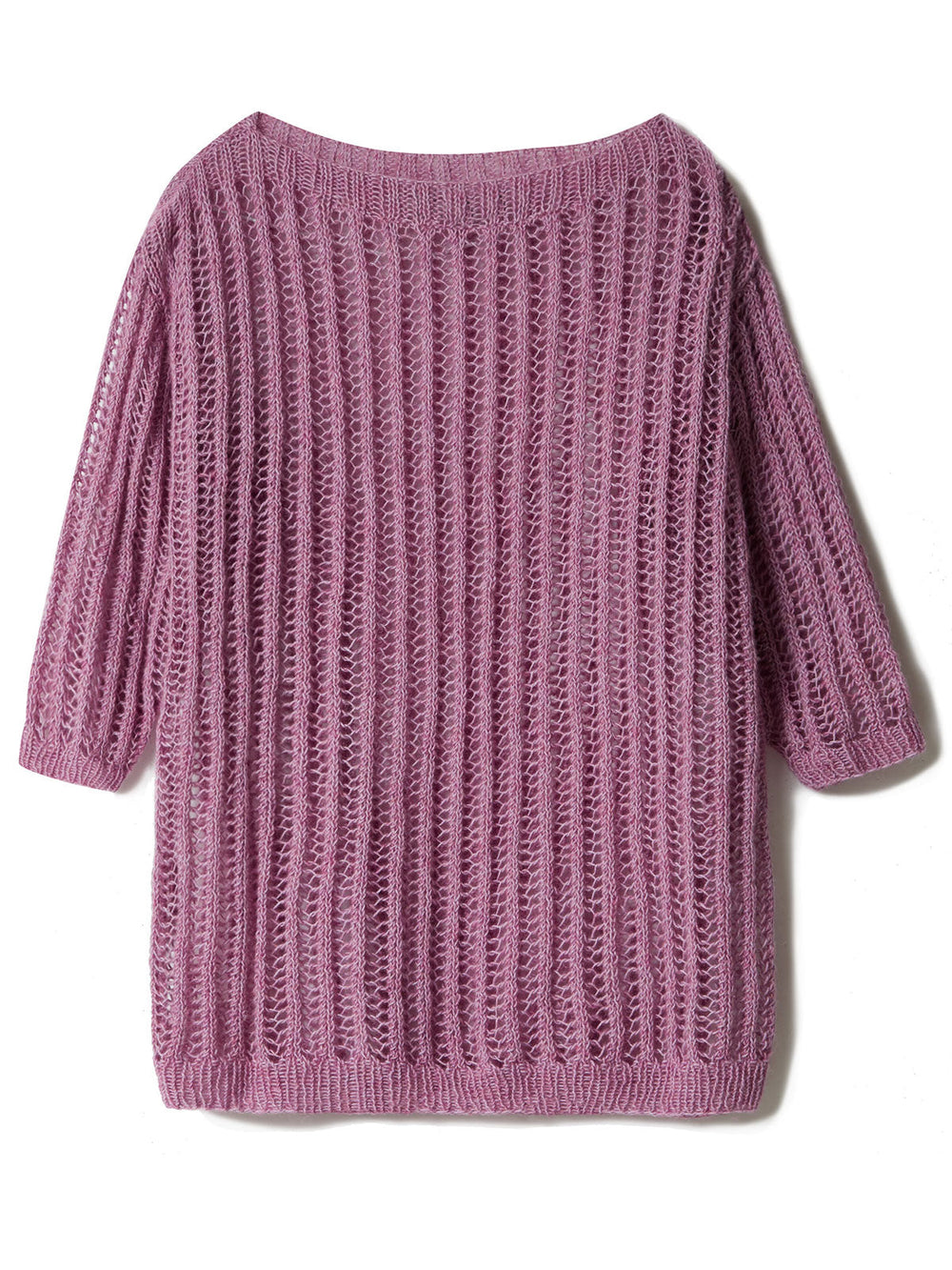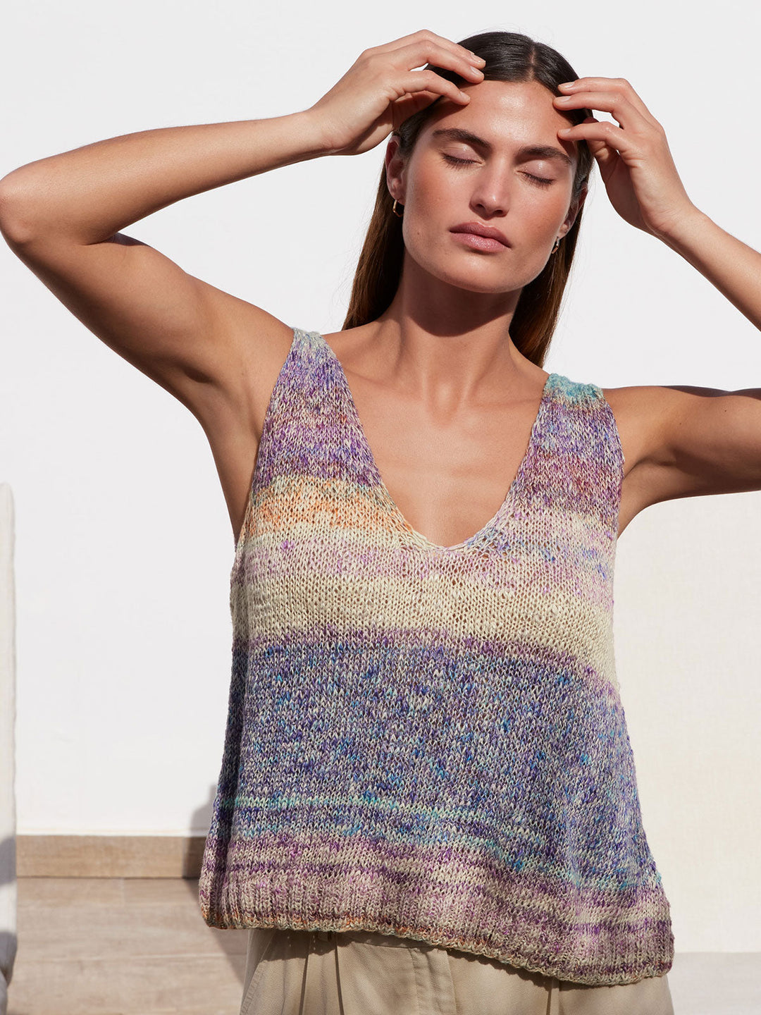 Dies war der erste Pullover, den ich in einem Stück von oben nach unten gestrickt habe. Die Ärmel rund zu stricken fand ich etwas mühsam, aber das Ergebnis gefällt mir und anderen sehr gut. Die Wolle läßt sich sehr gut verstricken, der Farbverlauf ist wunderschön. Sehr angenehm weiche Wolle. Sie scheint mir allerdings etwas empfindlich zu sein und ich hoffe, dass es nicht allzu sehr zu Flusenbildung kommt.