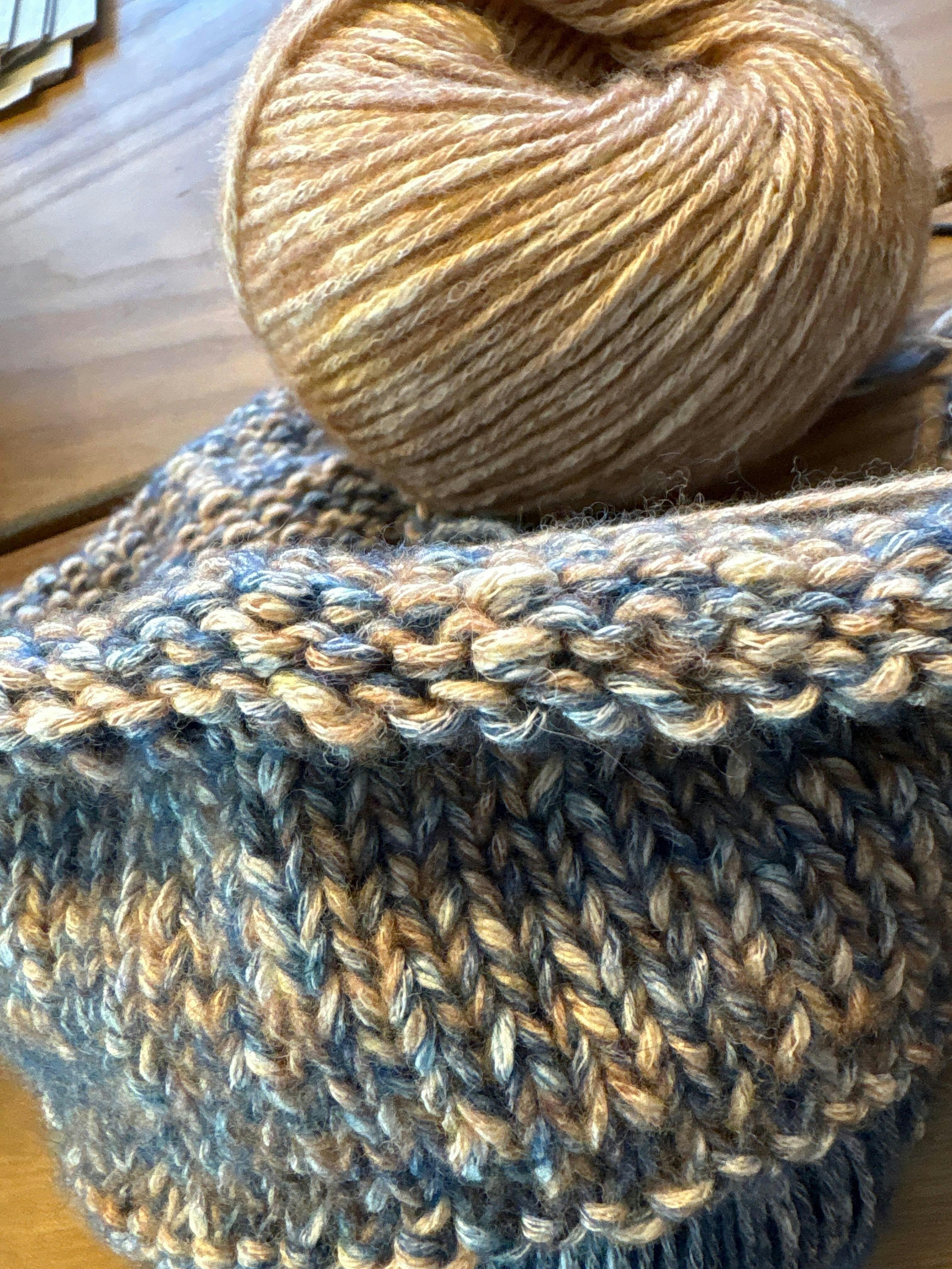 Der Schal ist das aktuellste Projekt (mein Mann muss ja auch mal bestrickt werden 😉). Das Material ist wunderbar. Es lässt sich gut verarbeiten. Das Maschenbild ist schön und gleichmäßig. Habe Nadelgröße 3,5 genommen.
