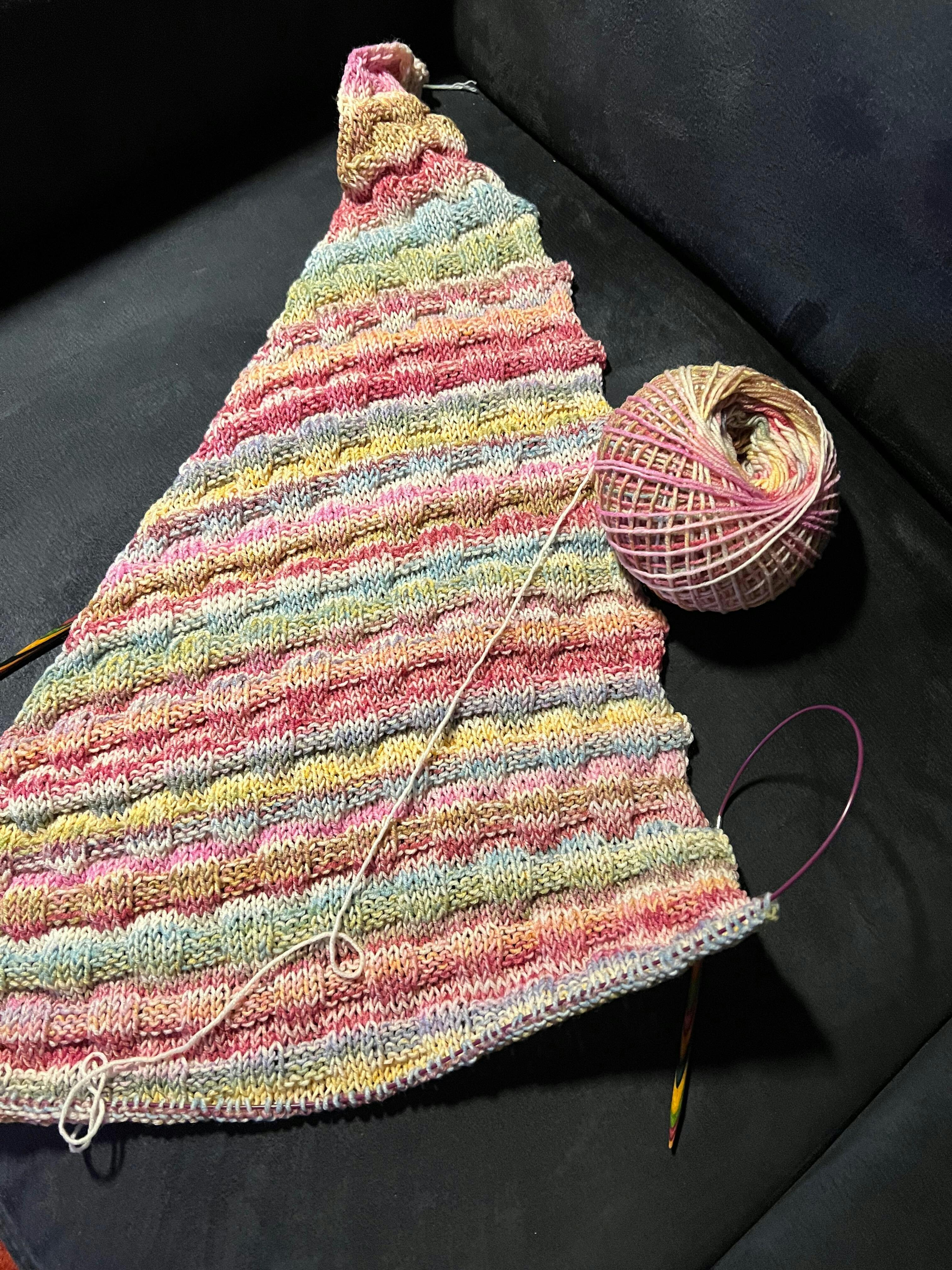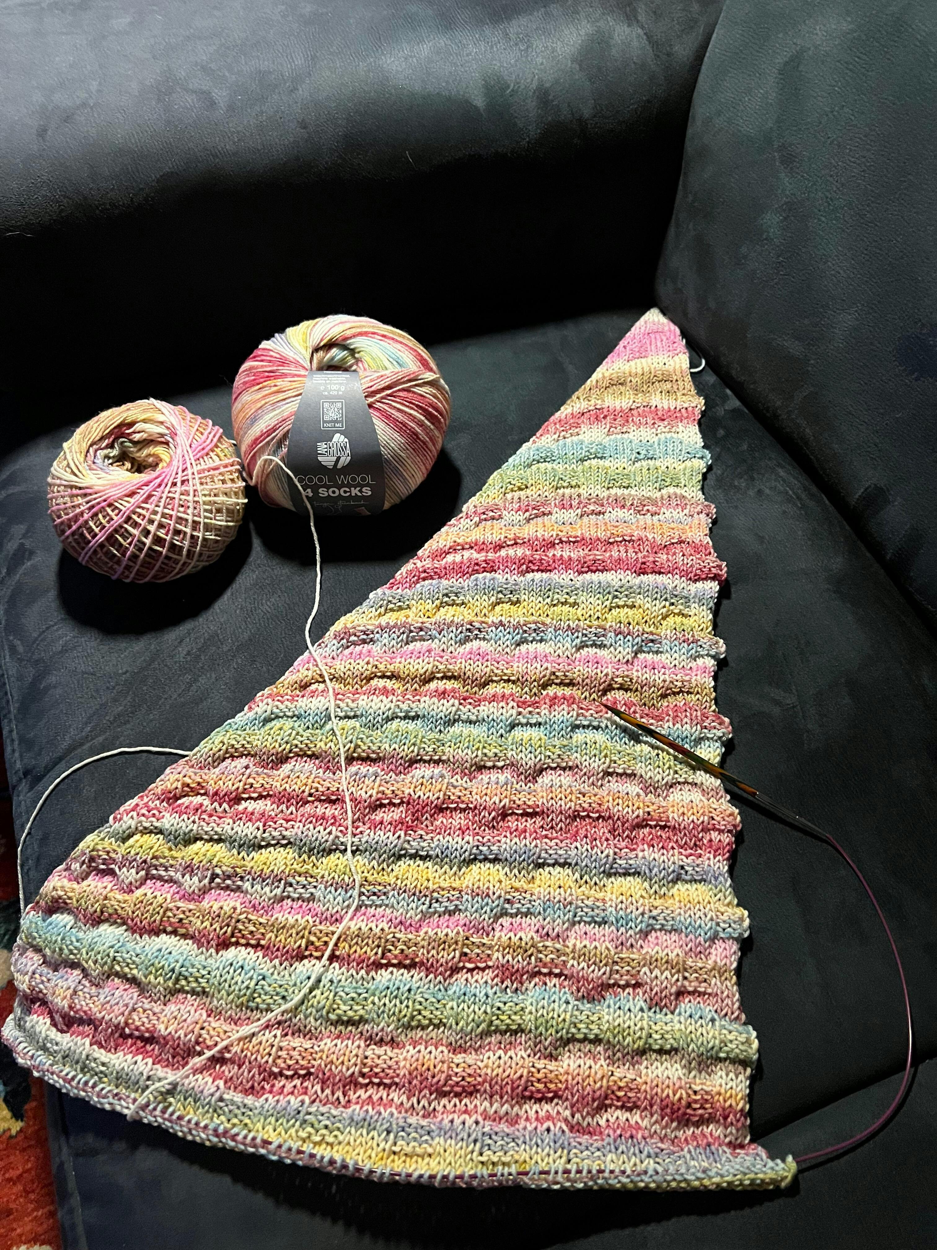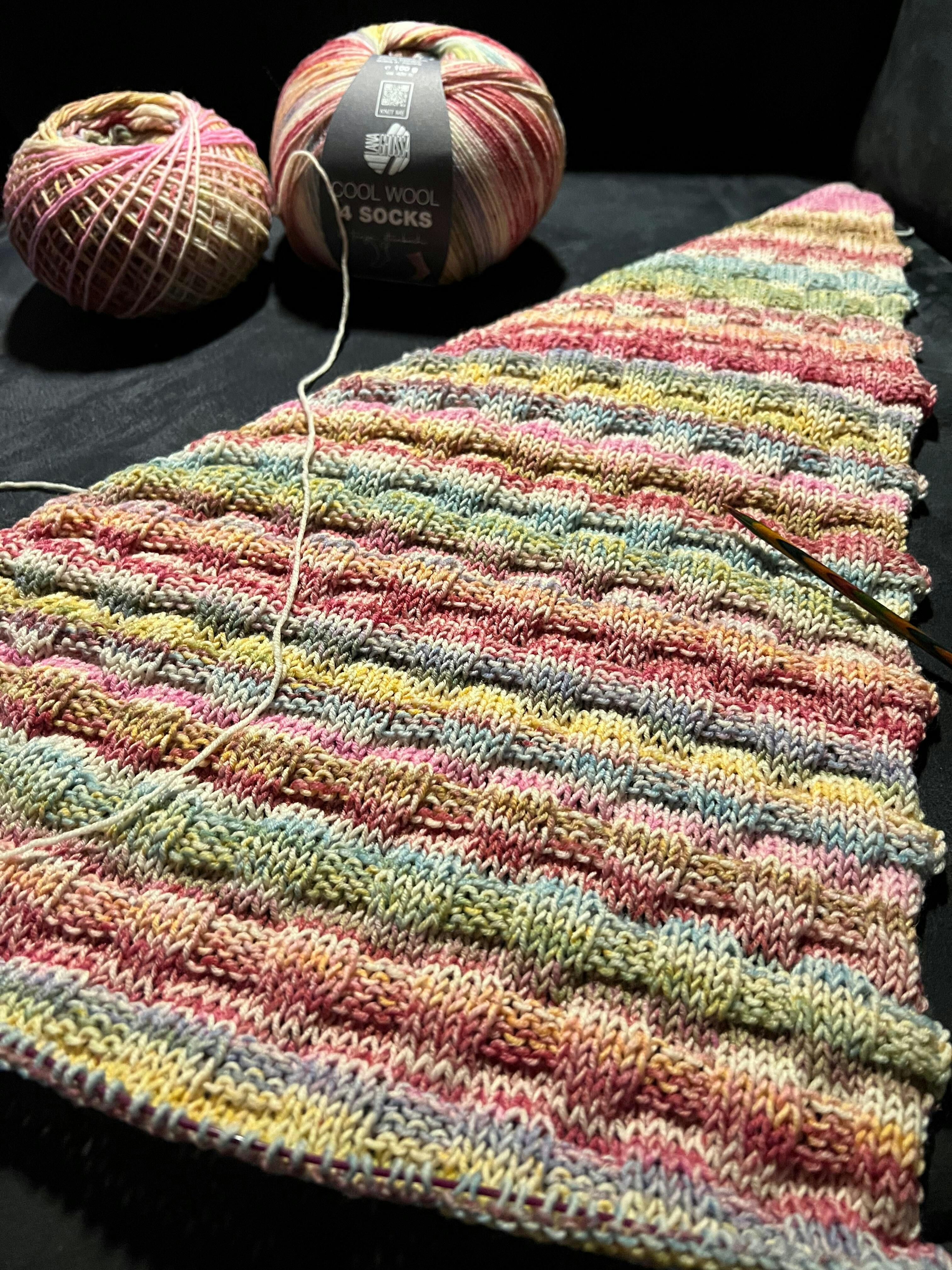 Wie zuvor schon erwähnt, aus der Sockenwolle, die so wunderbare Farben hat, ein buntes und fröhliches Tuch!