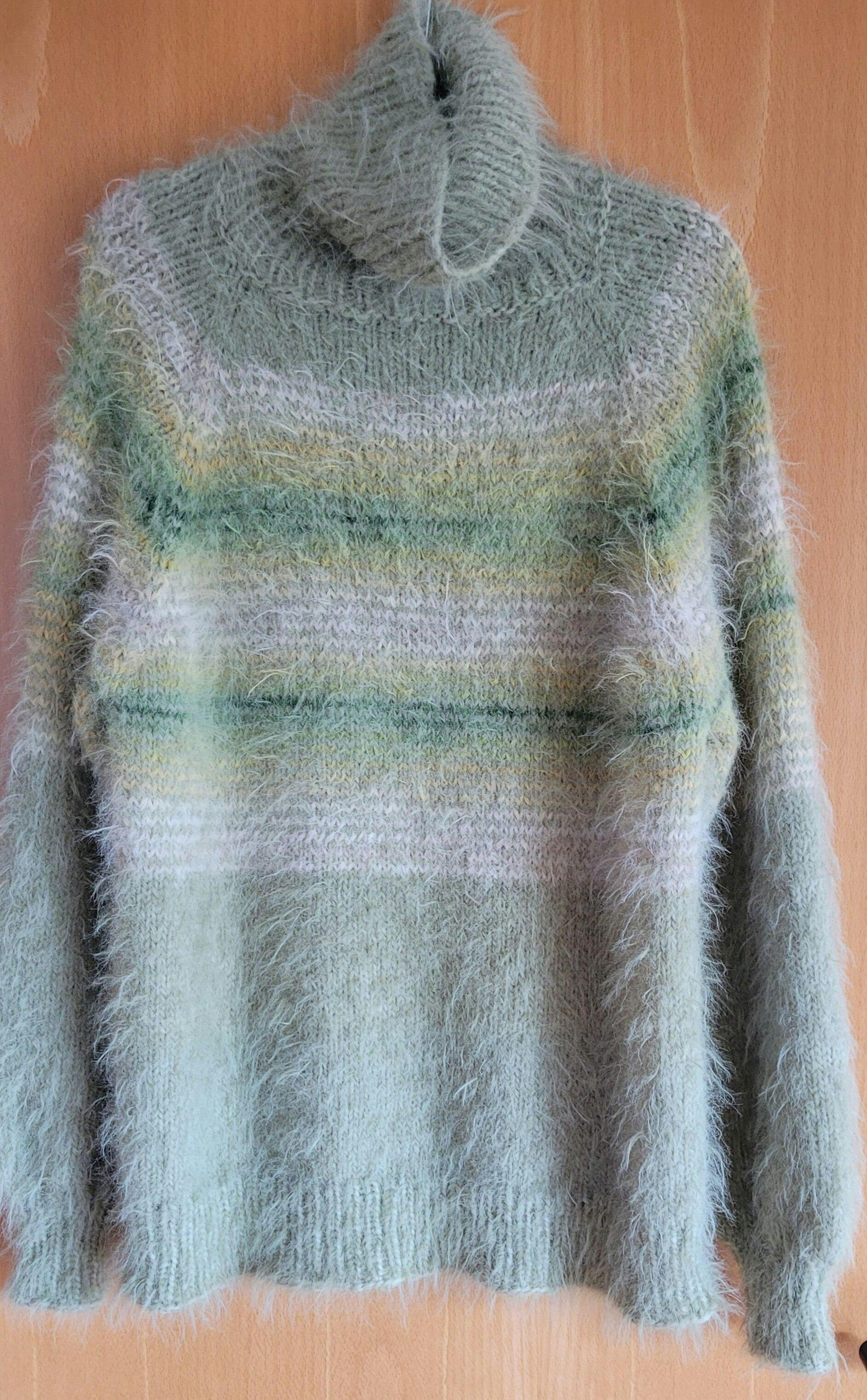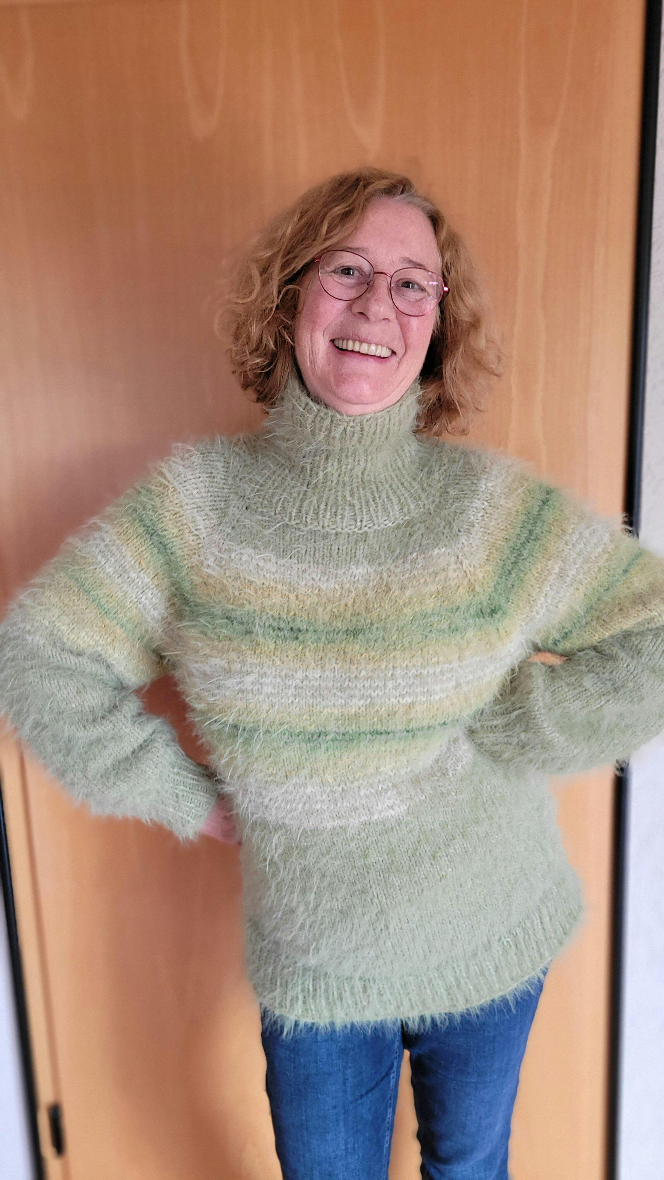 Ich habe die Abschlüsse des Pullovers geändert in " 1M. Rechts verschränkt, 1M. Links...). Damit rollen sich die Abschlüsse nicht. Am Kragen ebenfalls.