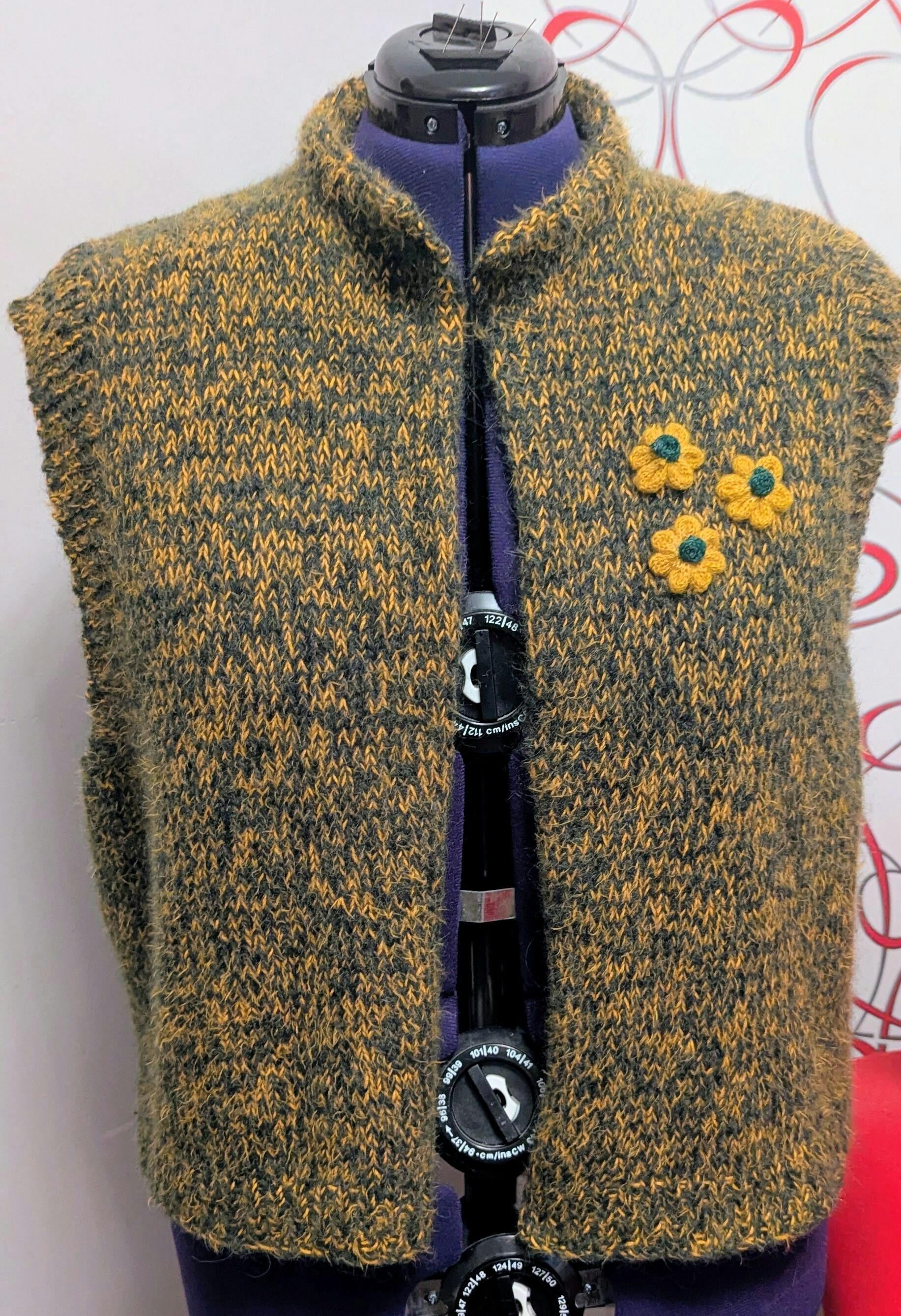 Ich habe diese Weste jetzt zum zweiten Mal gestrickt und bin von der Wolle Alpaka Air II (hier Lodengrün) total begeistert. Auch die Kombination mit Per Fortuna (hier Maisgelb) ist super. Das Strickmuster der Weste Mae von Tanja Steinbach ist leicht verständlich und gut nachzuarbeiten. Es wird sicher nicht die letzte Weste bleiben.