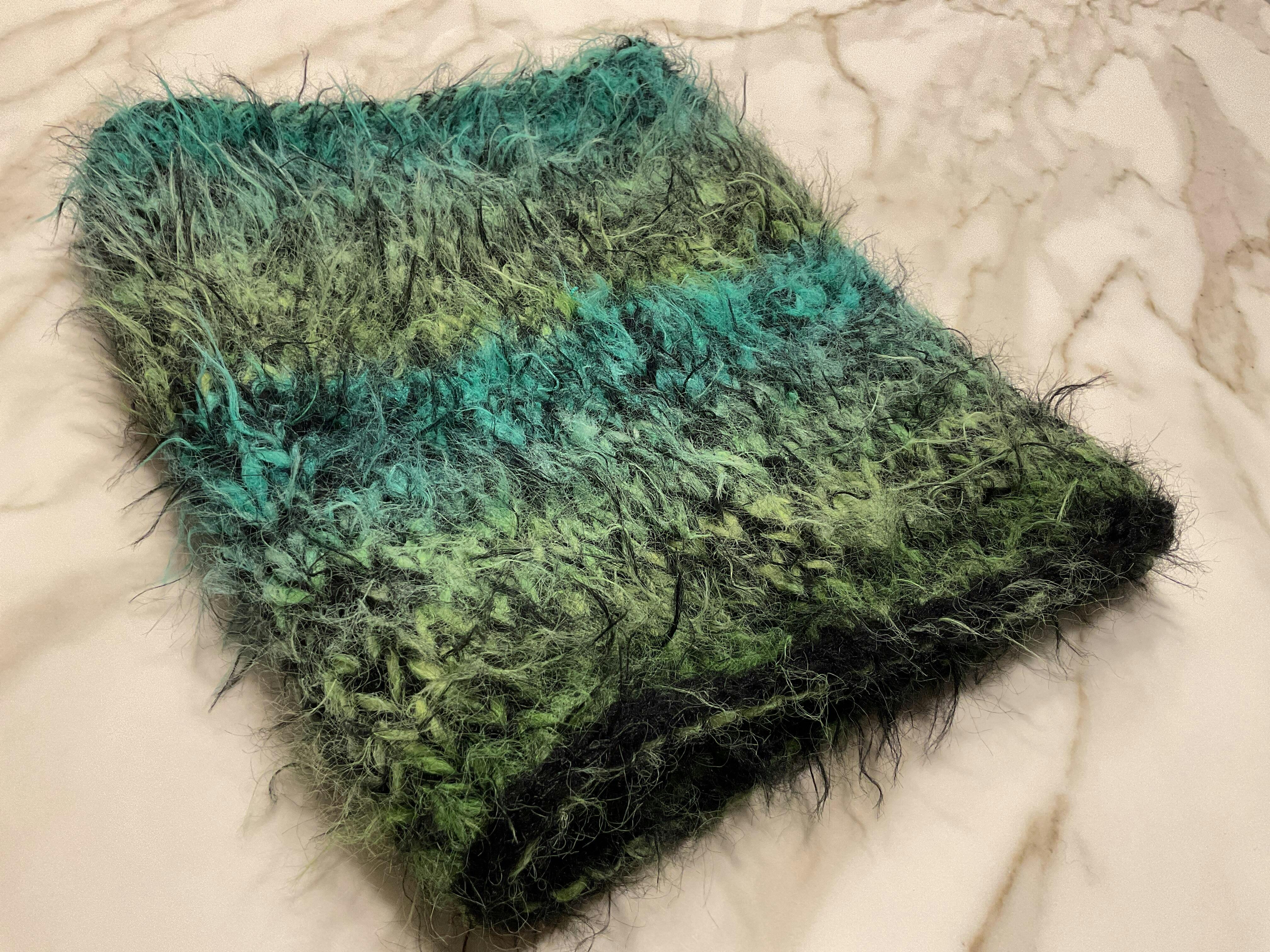 Flauschiges Ergebnis, angenehm zu tragen. Sieht super aus. Für mich waren allerdings die 3 Fäden nicht so schnell zu verarbeiten,hat aber trotzdem Spaß gemacht.