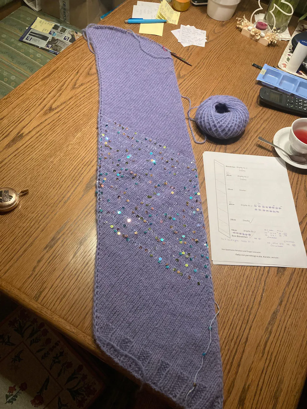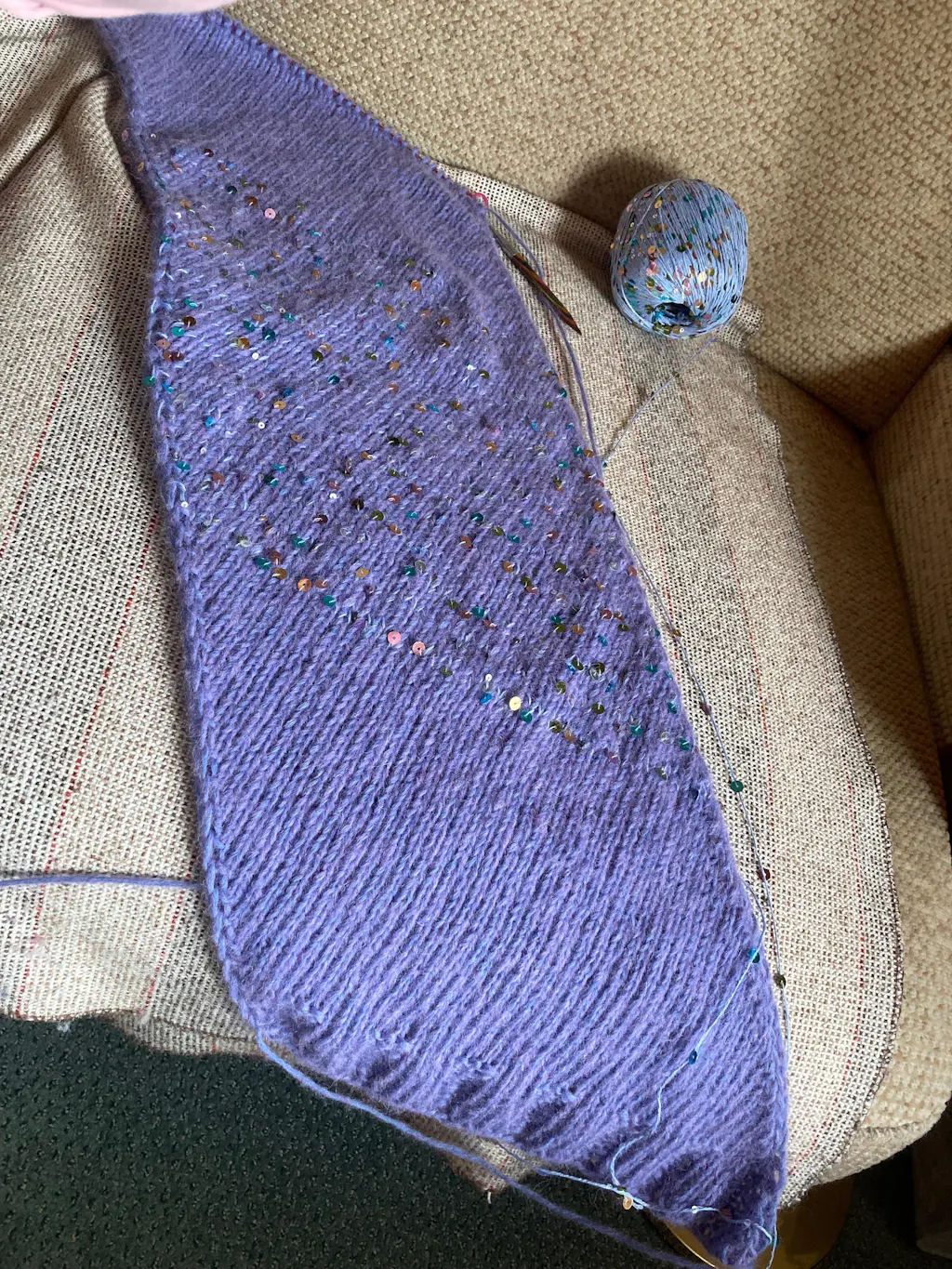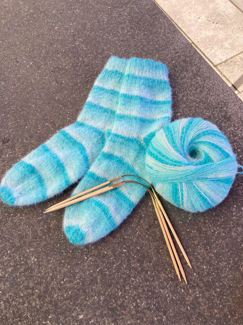 Ich stricke aus der Sockenwolle, gemischt mit Silkhair, ein großes weiches Tuch. Die Wolle gefällt mir für den Zweck sehr gut.