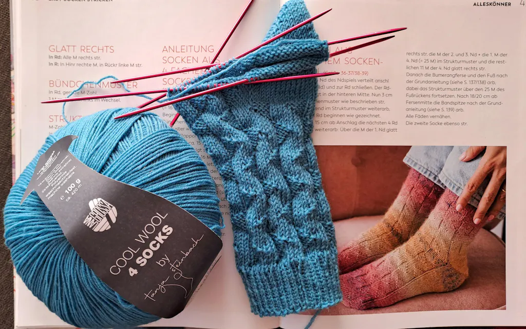 Schöne Sockenwolle, die ich schon öfters verstrickt habe. Ich bin sehr zufrieden damit. Hieraus entstehen ein paar Herrensocken mit einen Muster aus dem Buch "Socken Liebe" von Tanja Steinbach.