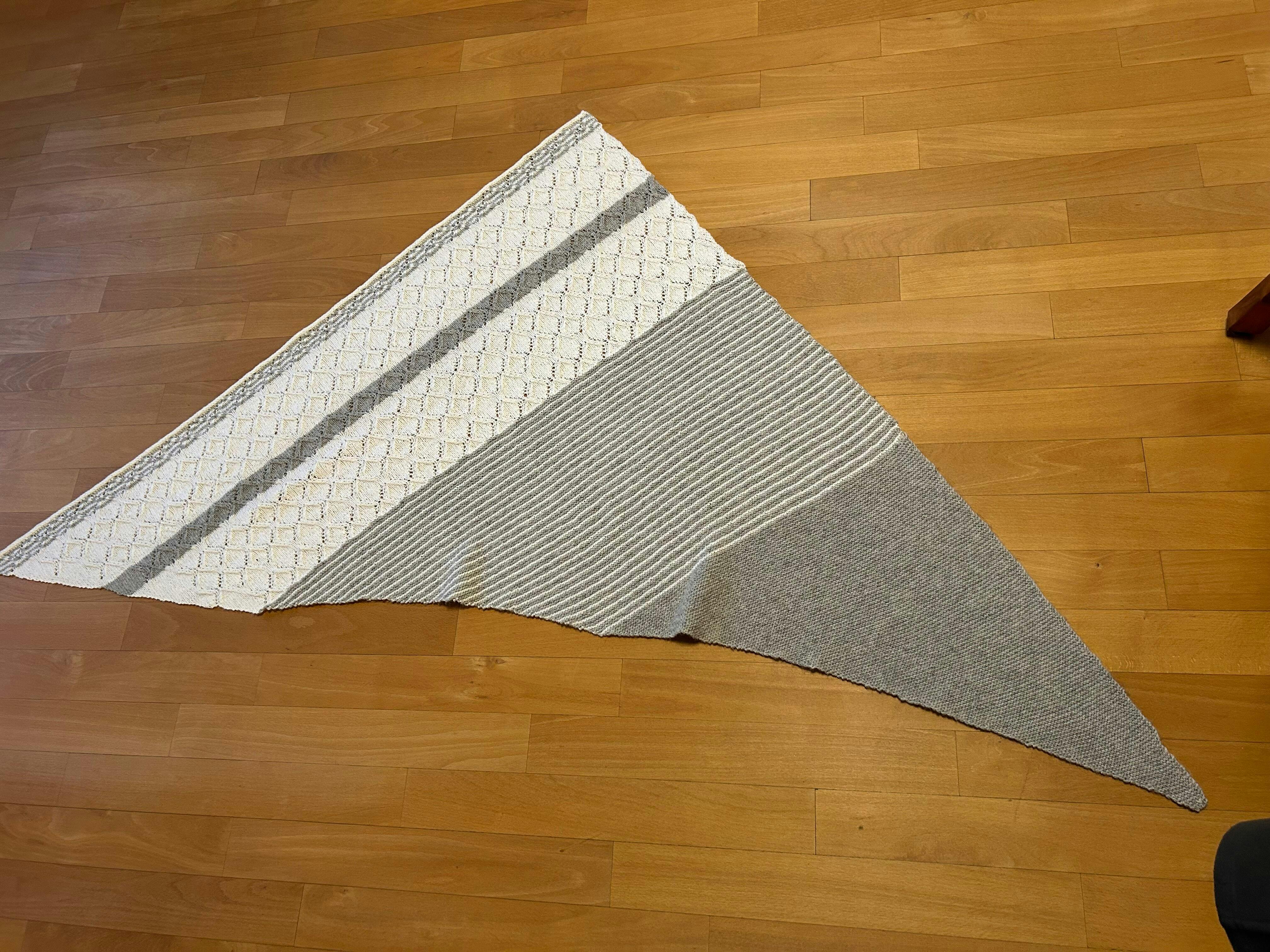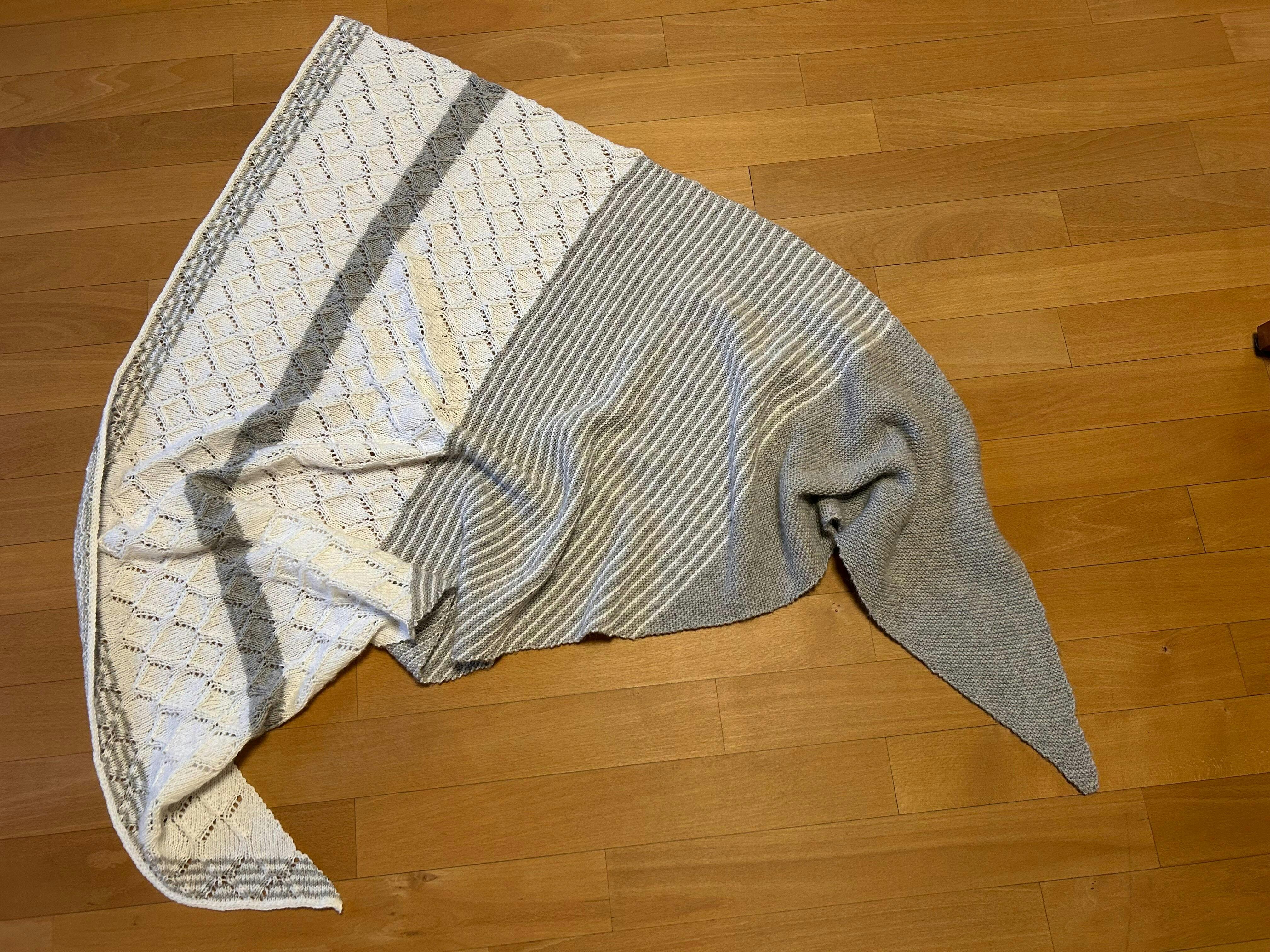 Nach meiner ersten Bewertung kam dann vor drei Wochen der graue Sonntag und ich habe mich erneut an dem Muschel-Muster versucht. Bin kläglich gescheitert und habe hin und her überlegt, was ich mit dem angefangenen Tuch nun mache. Nachdem ich gerade mein „Nordic Vibes“ von Liza fertiggestellt hatte und das Muster mega fand und finde, habe ich den Rest des Tuches damit gestrickt. Es ist nicht perfekt geworden, aber ich bin happy und lieb‘s jetzt schon🫶😍.