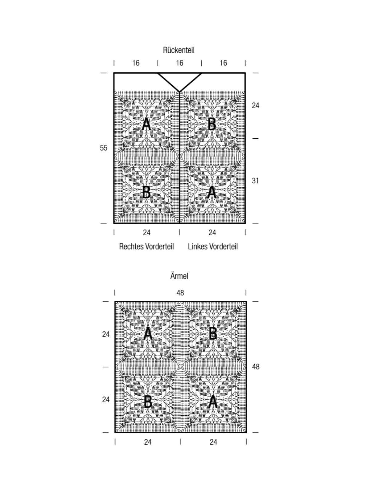 Material: Lana Grossa-Qualität „Cotonella” (100 % (Pima) Baumwolle, LL = ca. 140 m/50 g): ca. 300 g Pastellbeige (Fb. 202) und je ca. 150 Gelb (Fb. 205) und Mintgrün (Fb. 206); je 1 Wollhäkelnadel Nr. 4, 4,5 und 5; 7 Perlmuttknöpfe in Natur, ø 15 mm.