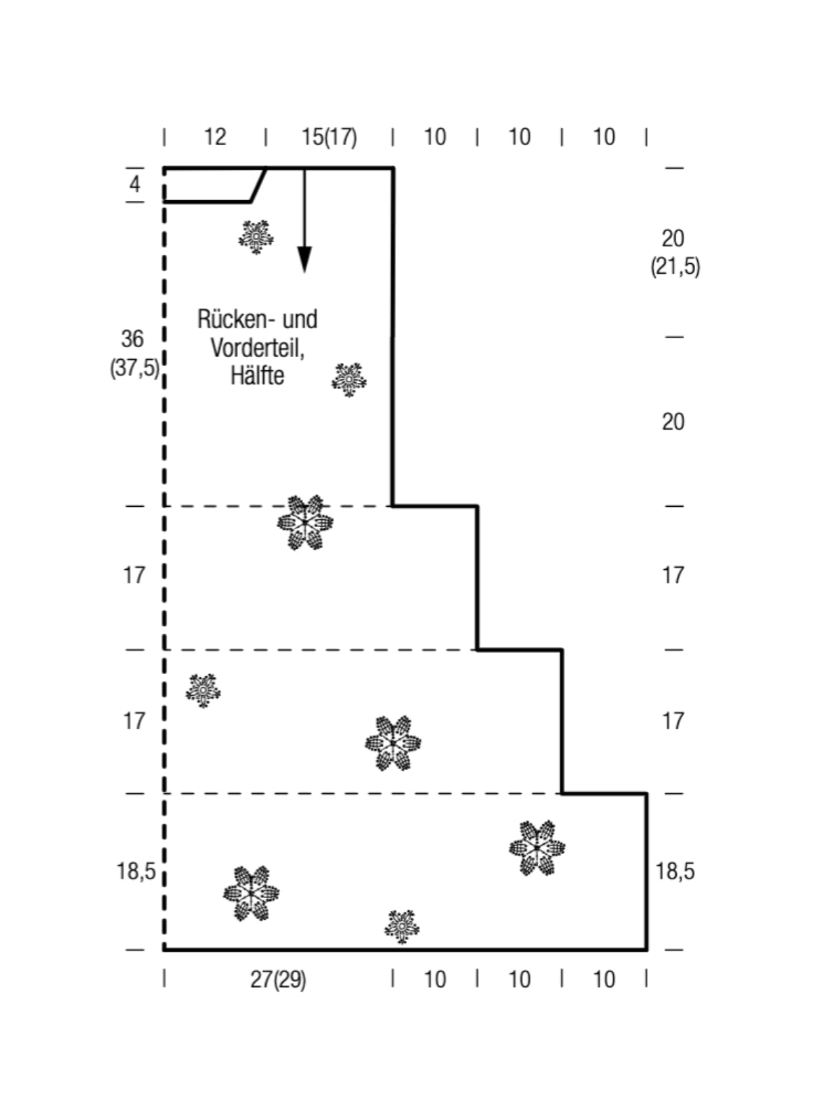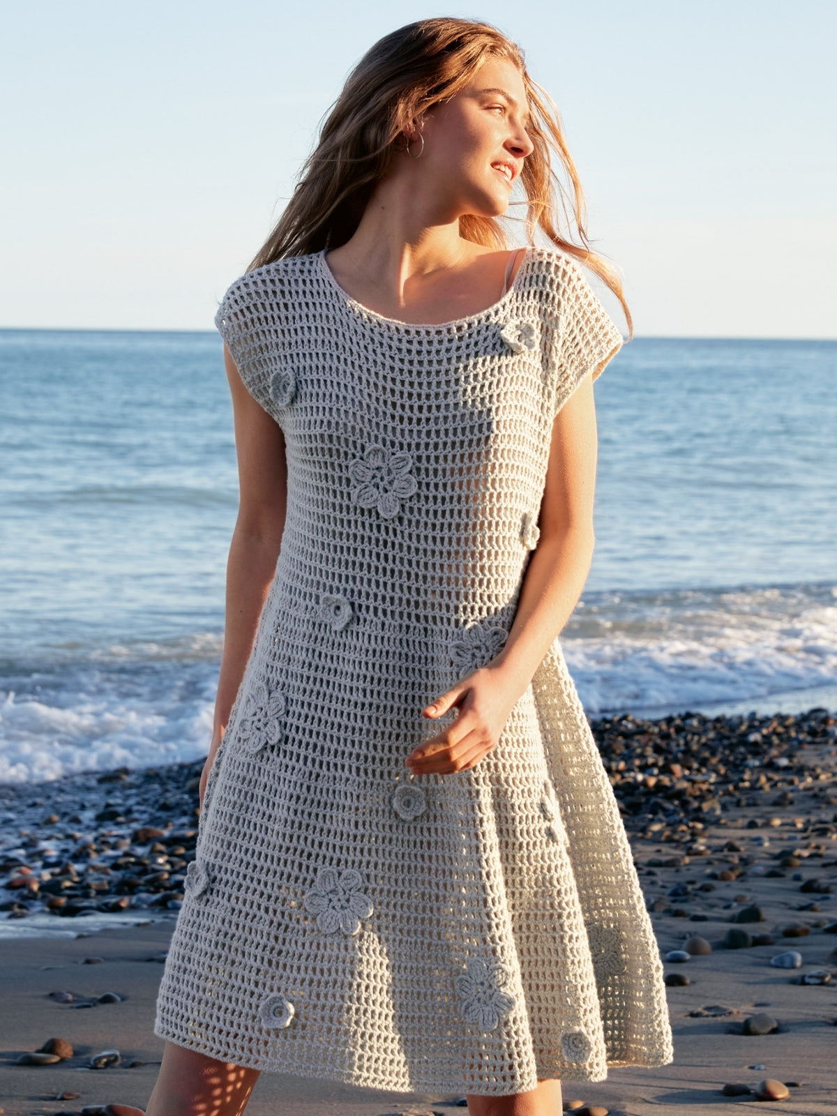 Dieses Kleid wird in Filethäkeltechnik gearbeitet, die einzelnen Blumen werden am Ende angebracht.