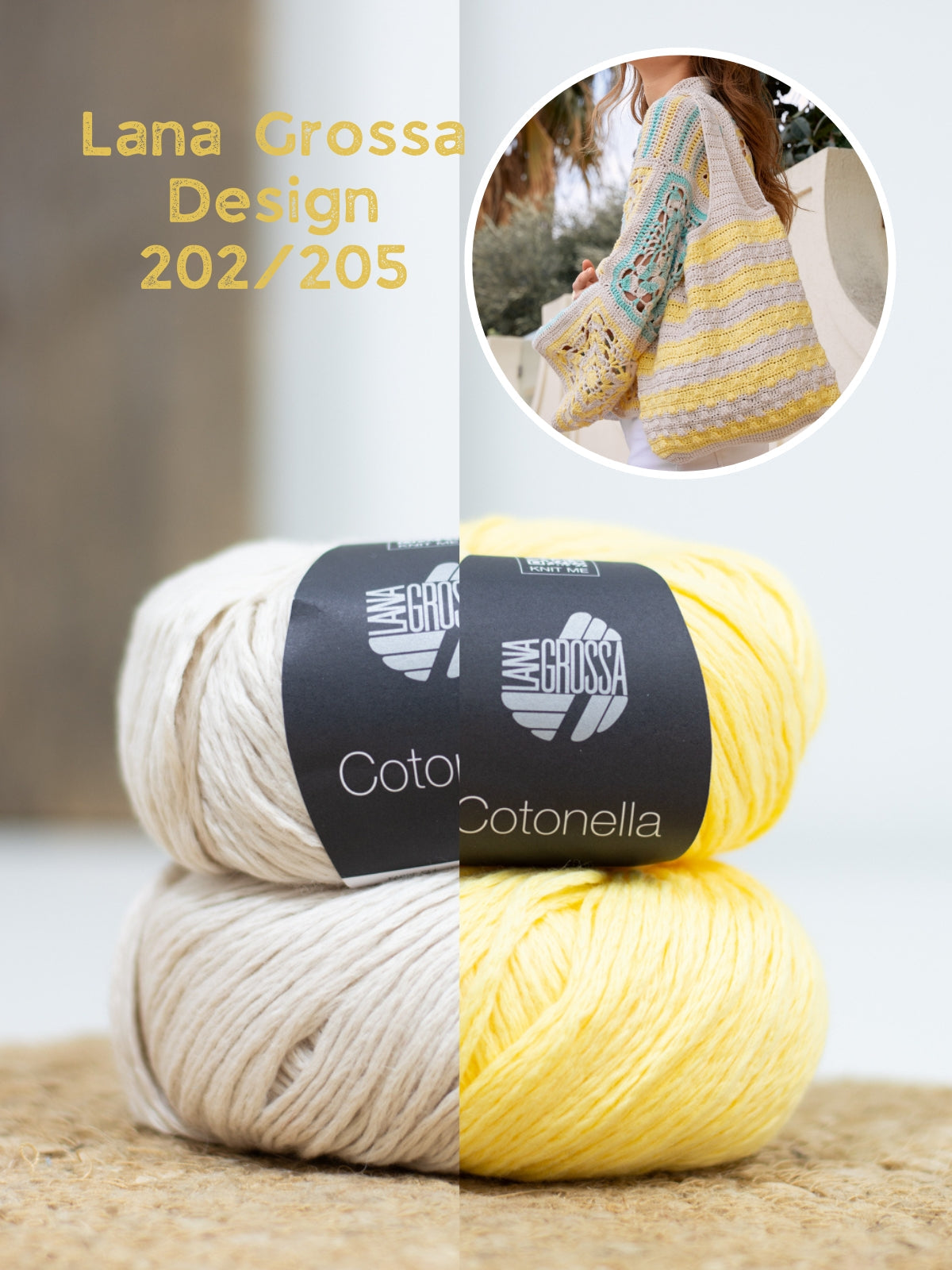 Material: Lana Grossa-Qualität „Cotonella” (100 % (Pima) Baumwolle, LL = ca. 140 m/50 g): je ca. 150 g Pastellbeige (Fb. 202) und Gelb (Fb. 205); 1 Wollhäkelnadel Nr. 4.