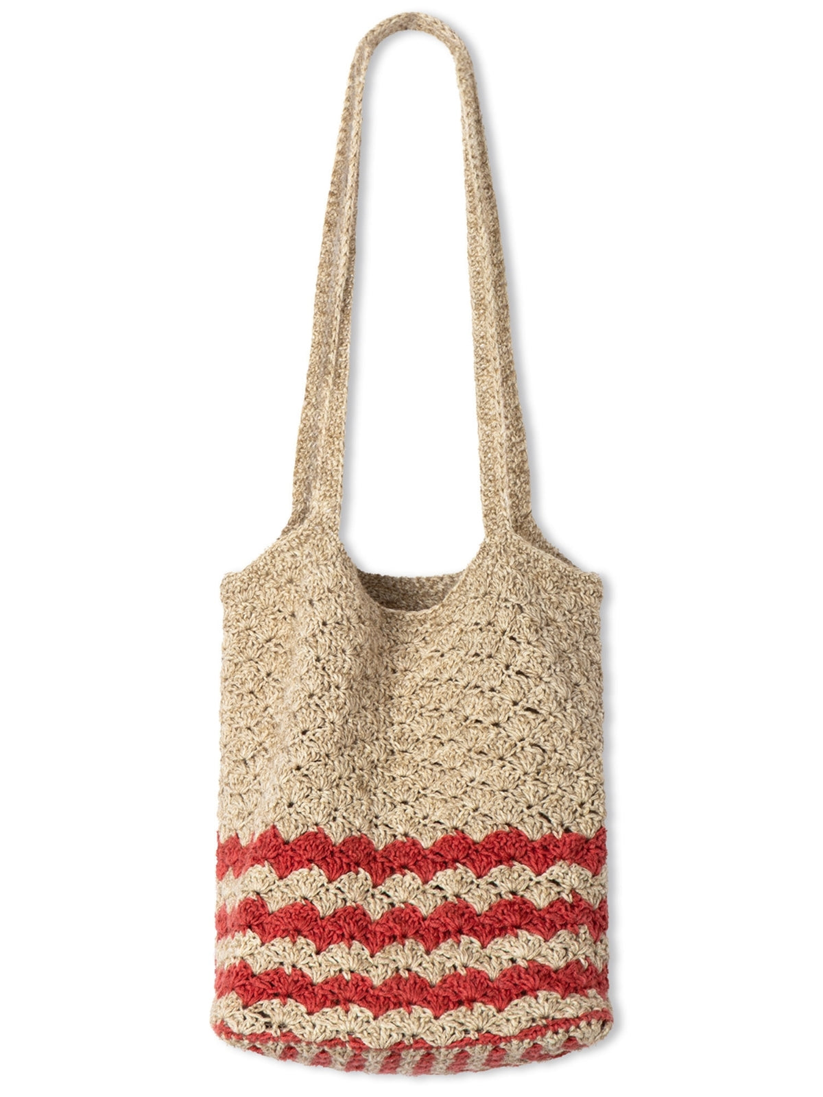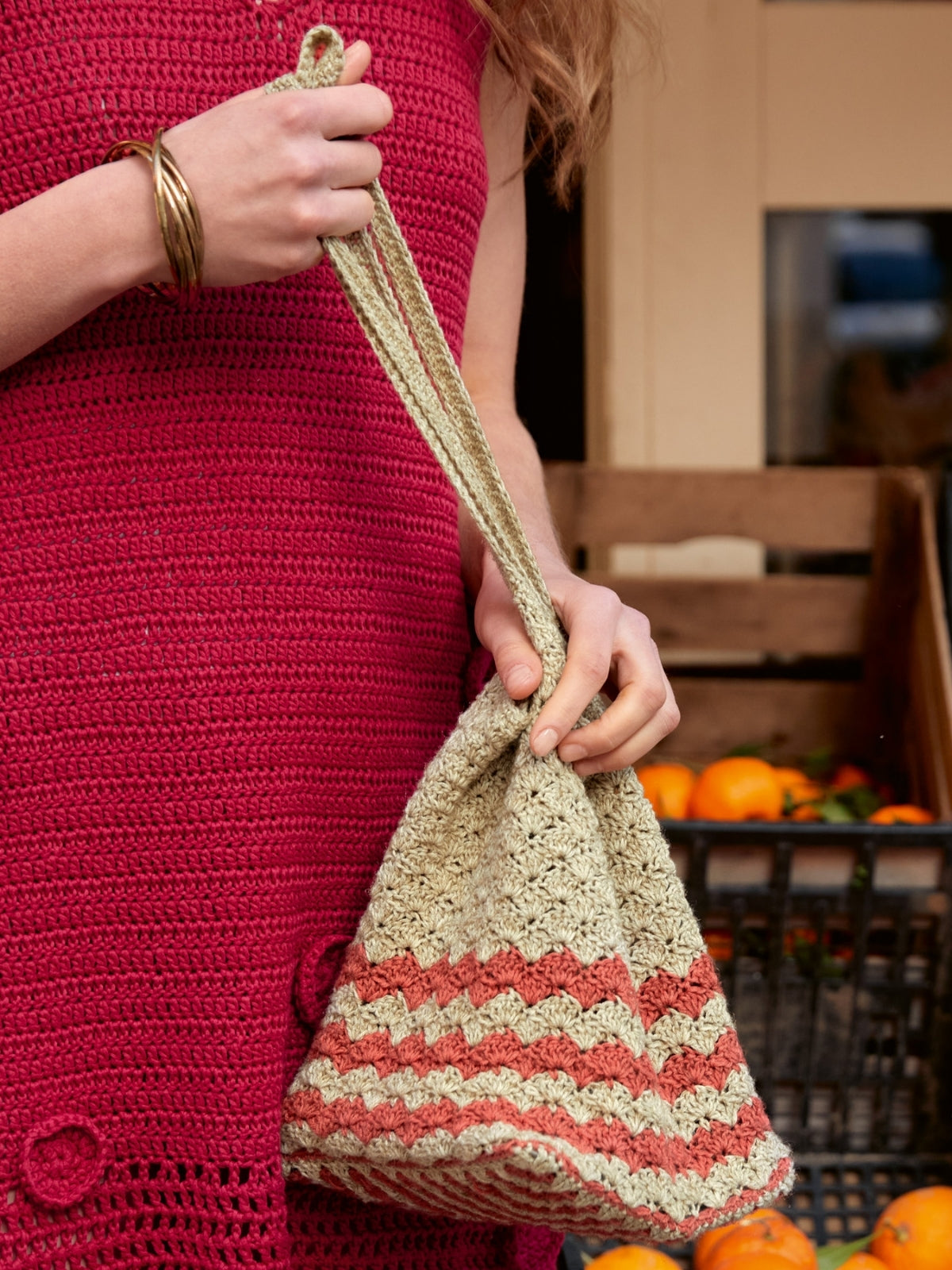 Diese fröhliche Tasche wird in Streifen gehäkelt und hat einen quadratischen Boden.