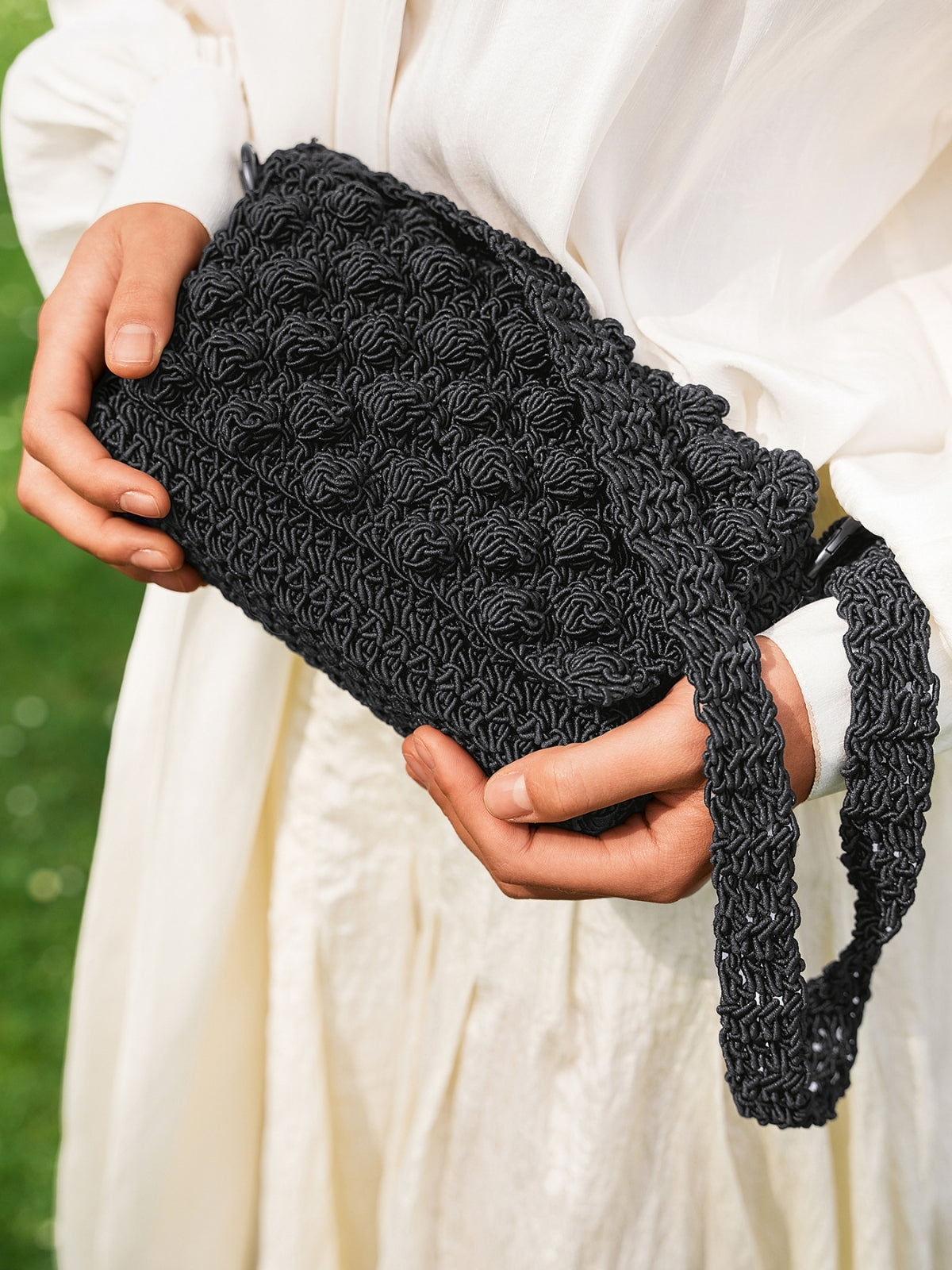 Gehäkelt wird sie mit The Core, einem Garn aus 50 % Baumwolle und 50 % Polyester. Die Tasche ist ca. 21 cm breit, 13 cm hoch und 4 cm tief (ohne Henkel).
