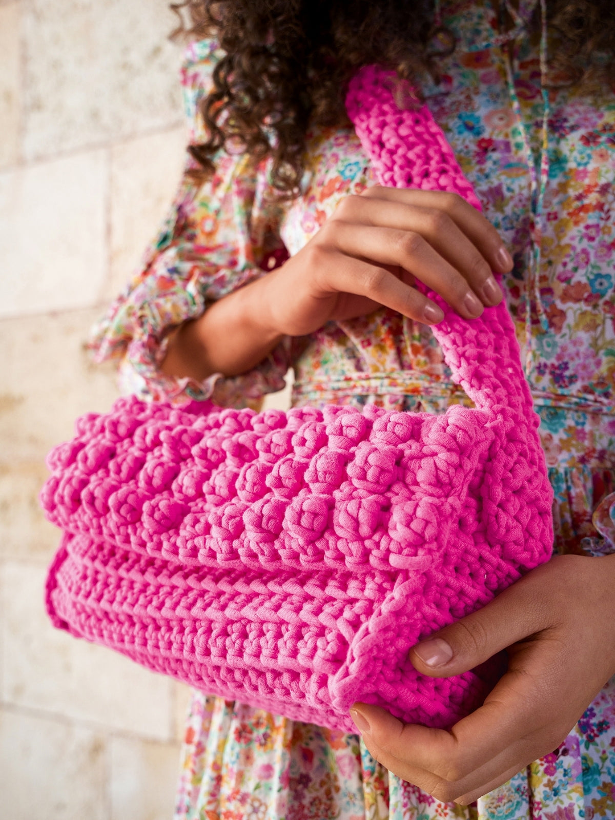 Gehäkelt wird sie mit The Tube, einem Garn aus 60 % Baumwolle und 40 % Nylon. Die Tasche ist ca. 30 cm breit, 13 cm hoch und 10 cm tief (ohne Henkel).