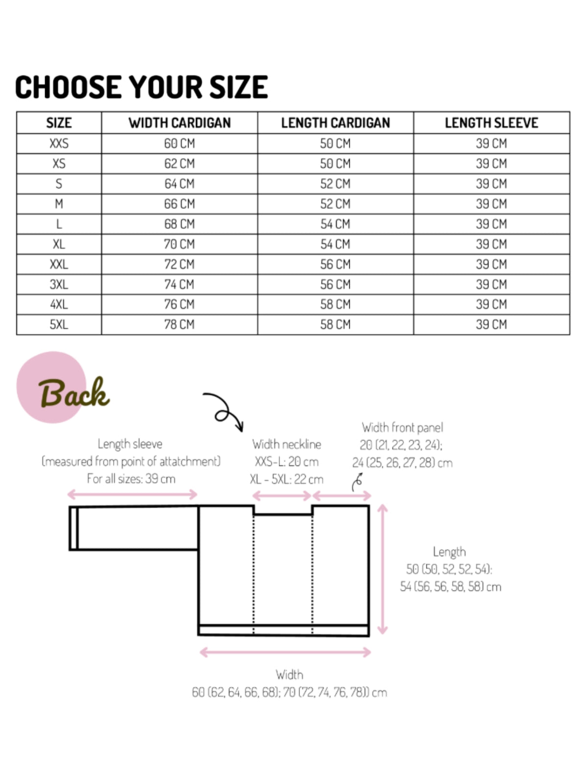 Die Jacke wird mit Alpaca Air II gehäkelt, einem Garn aus 50% Babyalpaka, 27% Polyamid, 14% Baumwolle und 9% Merinowolle. Die Anleitung ist für die Größen XXS bis 5XL ausgeschrieben.