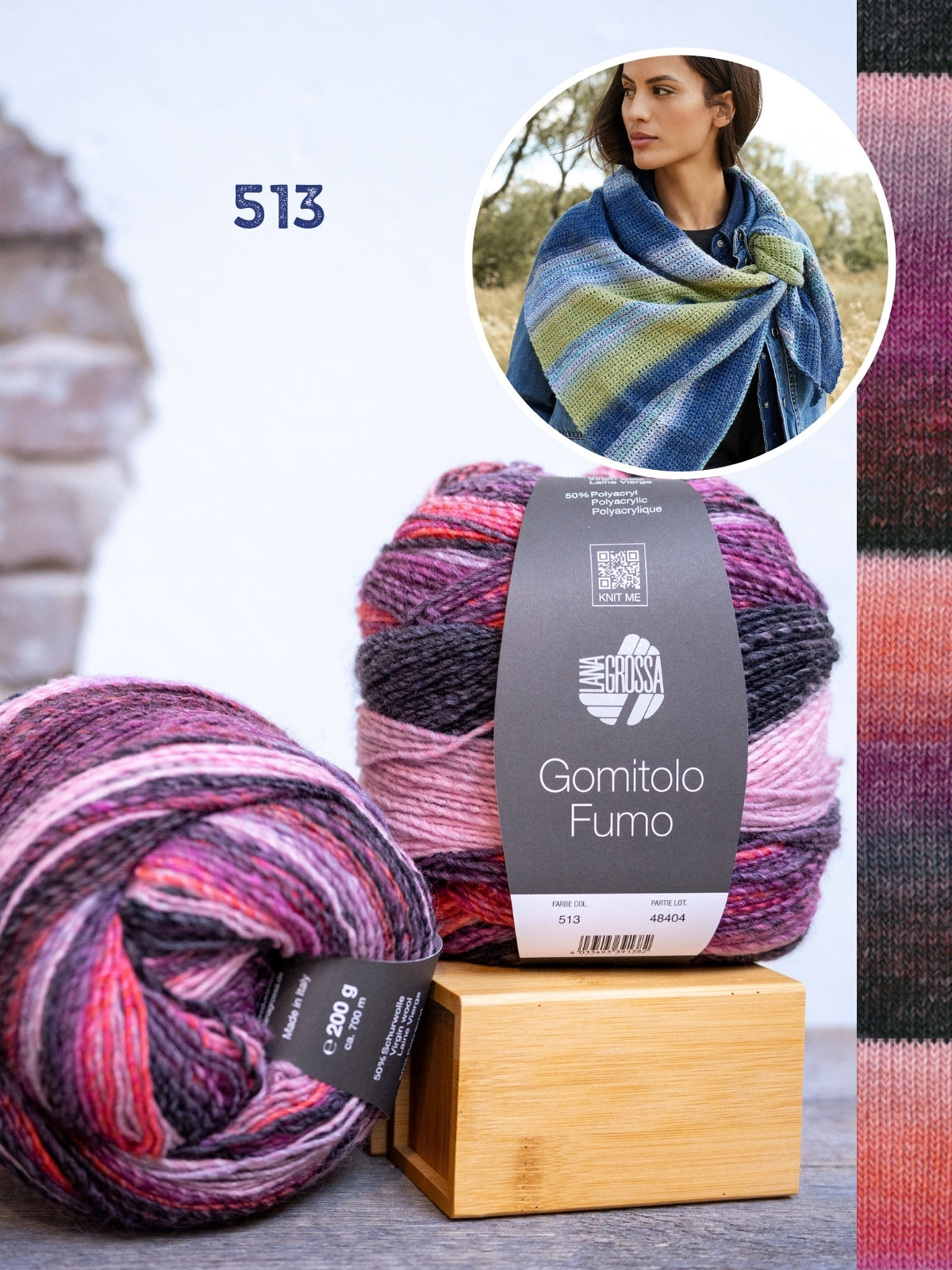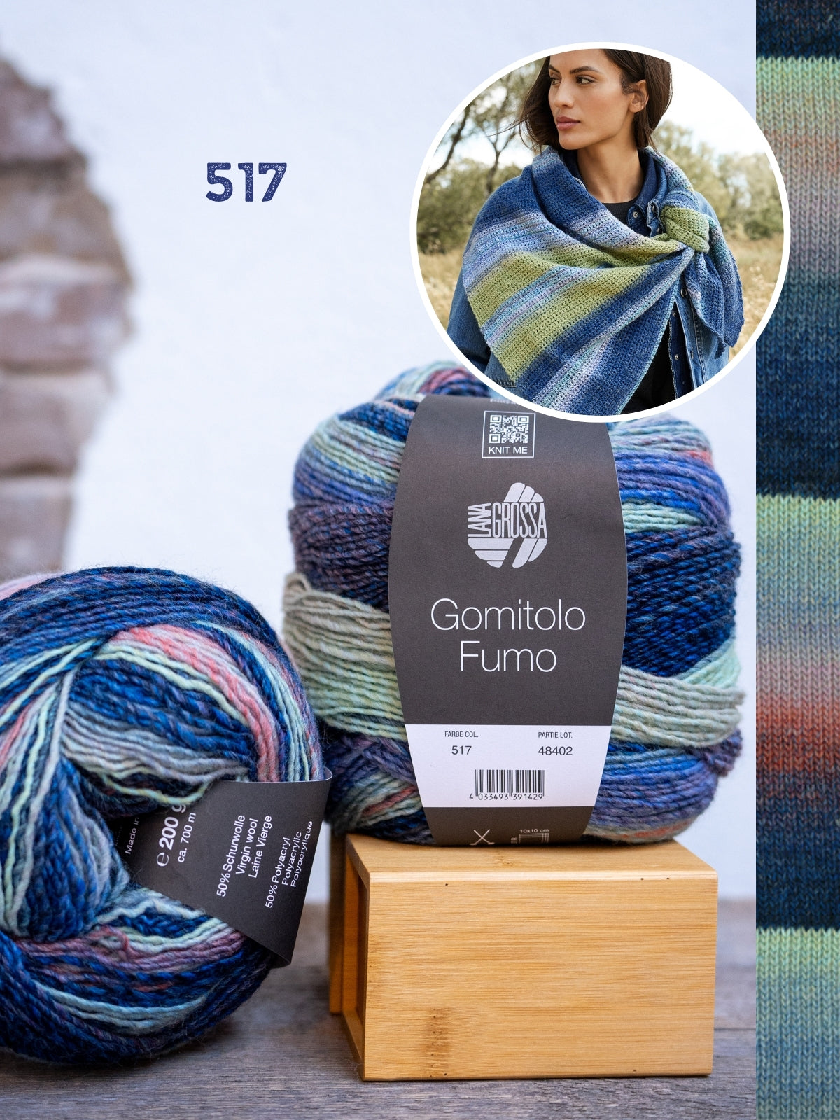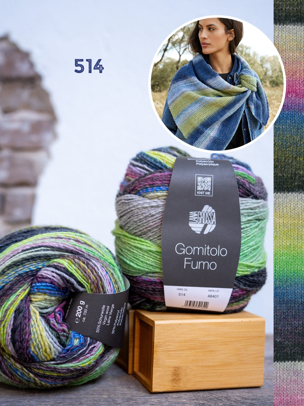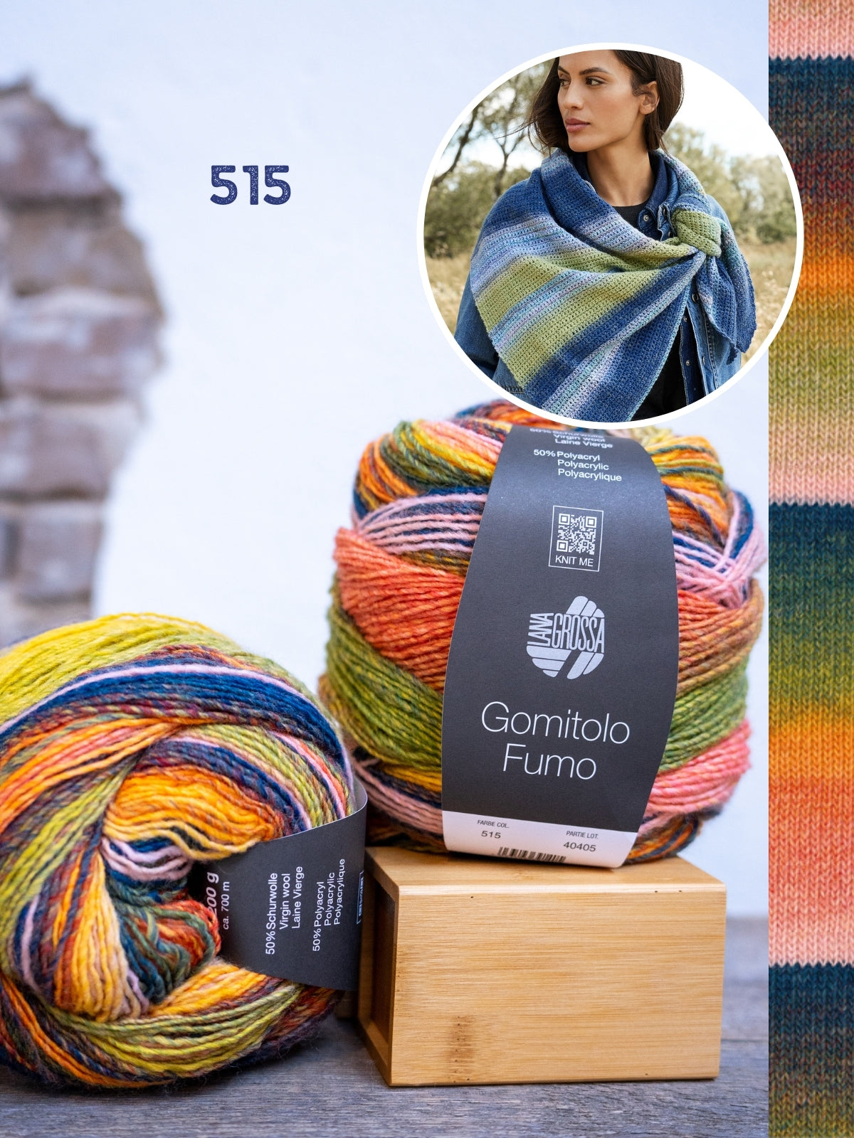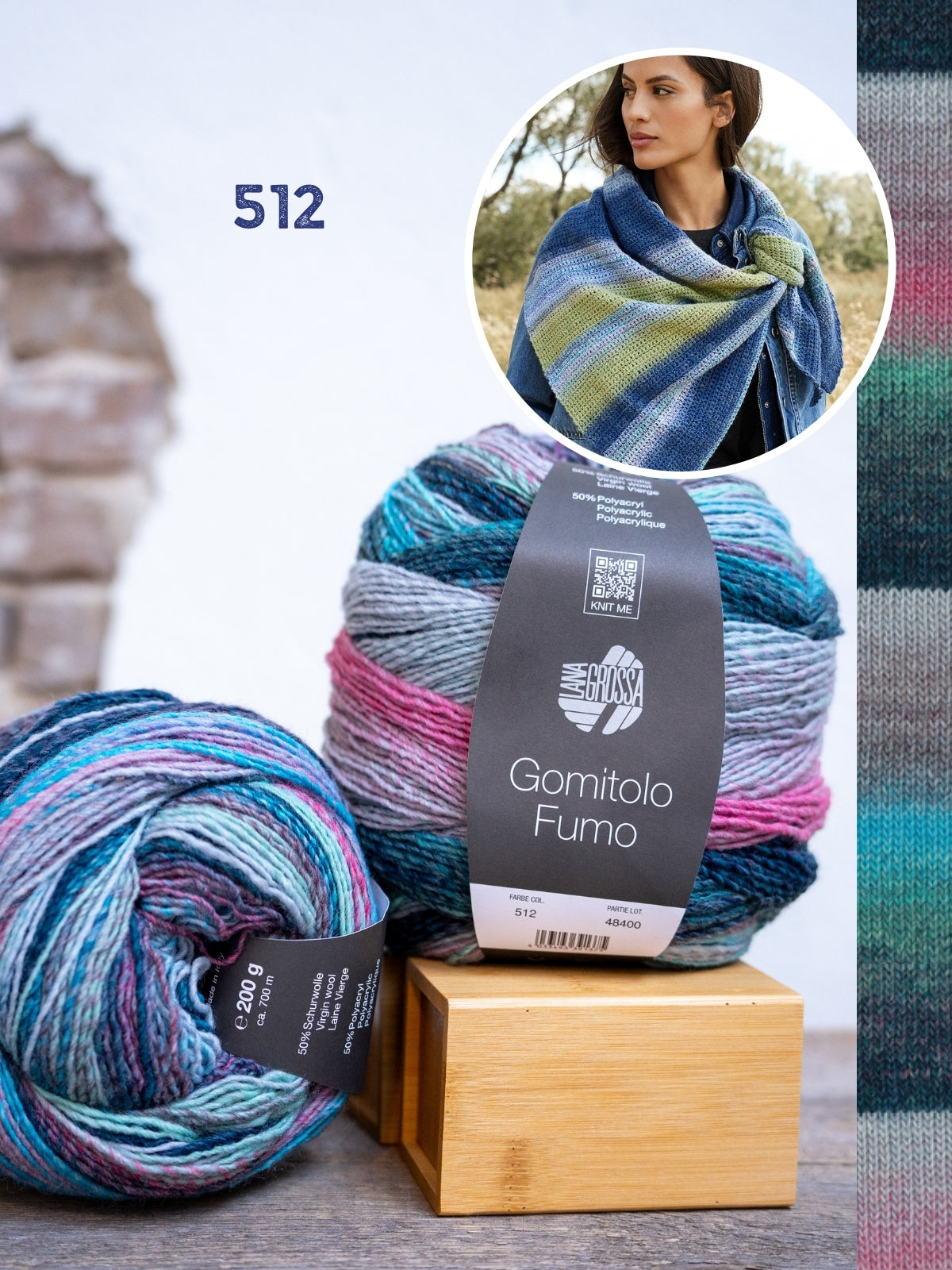Das Paket enthält ein Knäuel Gomitolo Fumo und das Knotten-Anleitungsheft. Sie können die benötigten Hakelnadel (4.5mm) gleich hier in Ihren Warenkorb legen.