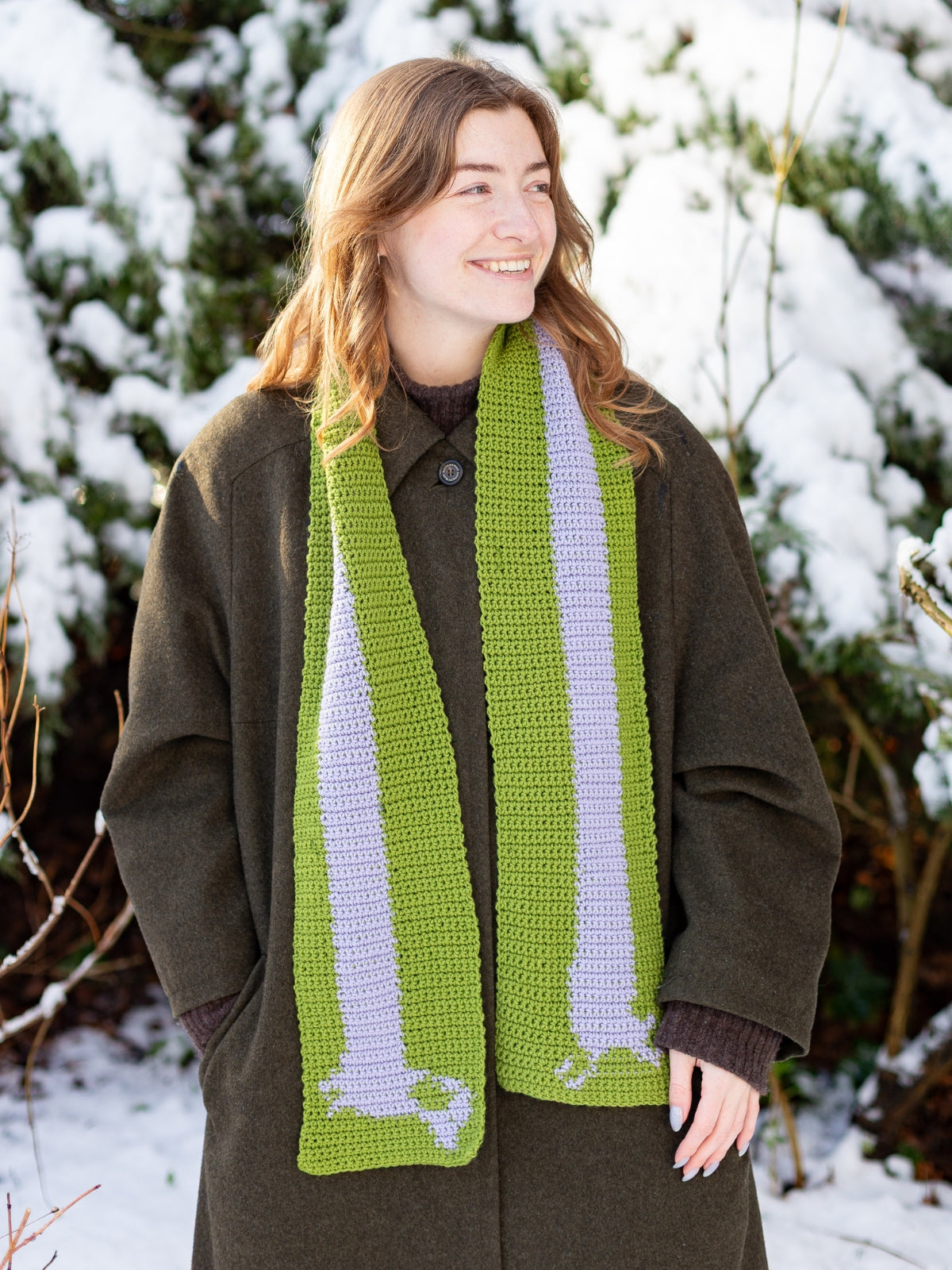 Der Schal wird mit zwei unterschiedlichen Farben gehäkelt. Die englischsprachige Anleitung verweist auf Tutorials und einen ausführlichen Guide und enthält außerdem ein Zählmuster sowie vollständig ausgeschriebene Anweisungen. Lieber stricken? Dieses Paket finden Sie hier.