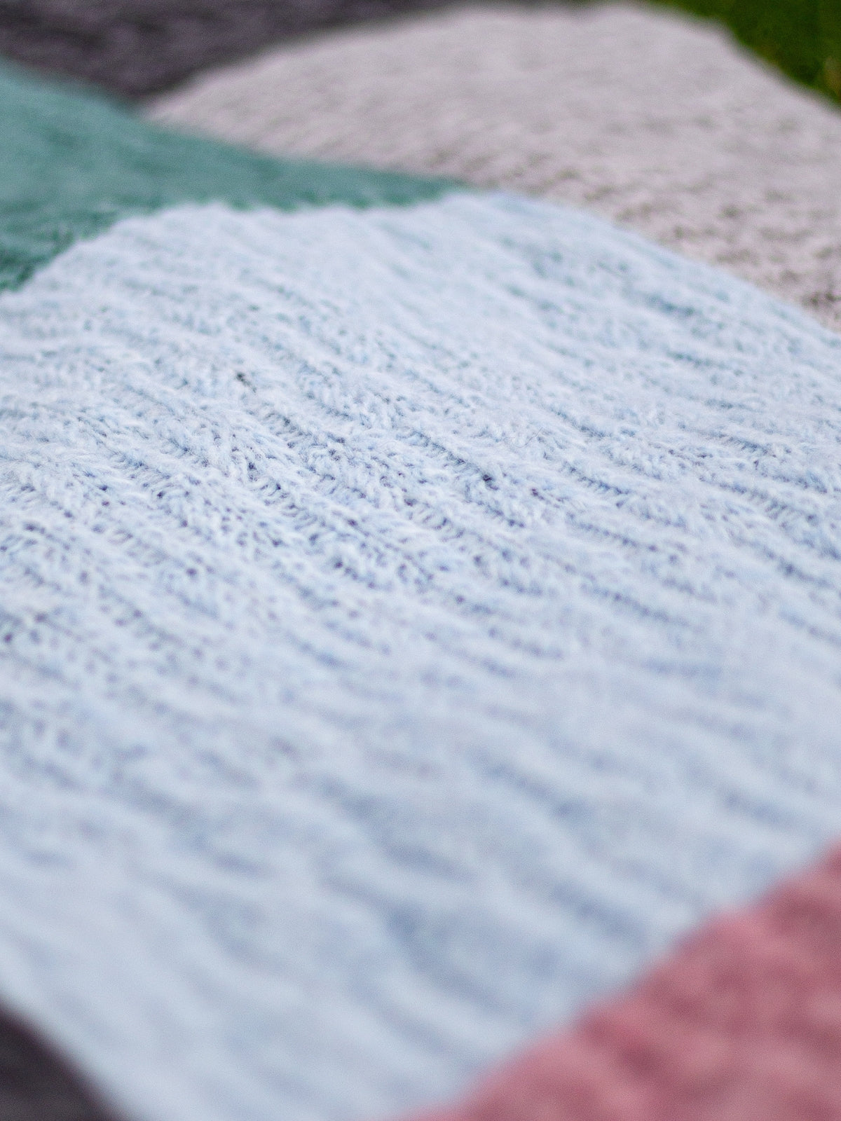 Die Decke wird mit Alpaca Air II gearbeitet. Dieses Garn besteht aus 50% Babyalpaka, 27% Polyamid, 14% Baumwolle, 9% Merinowolle. Die Decke hat eine Größe von ca. 170 cm x 114 cm.
