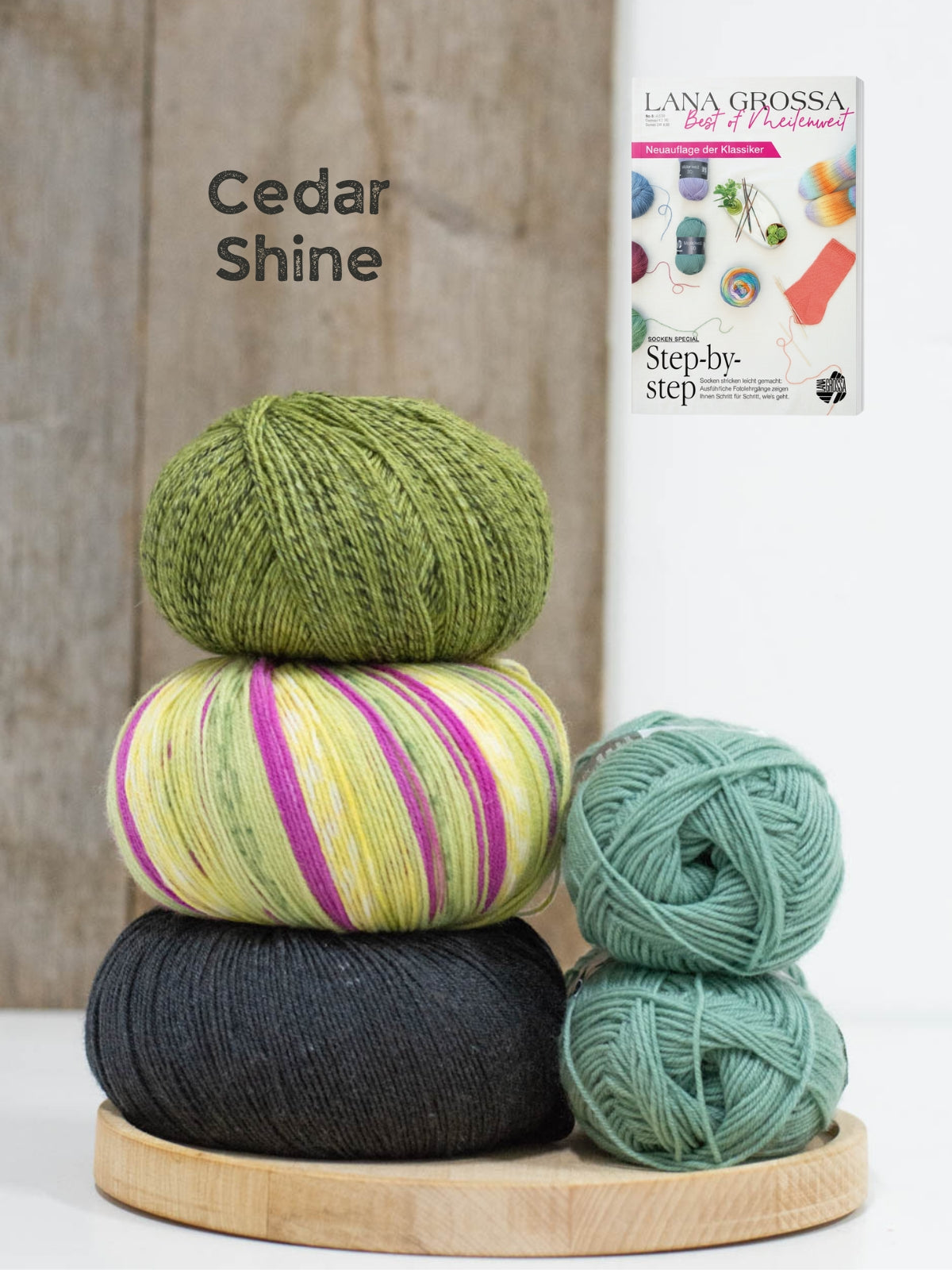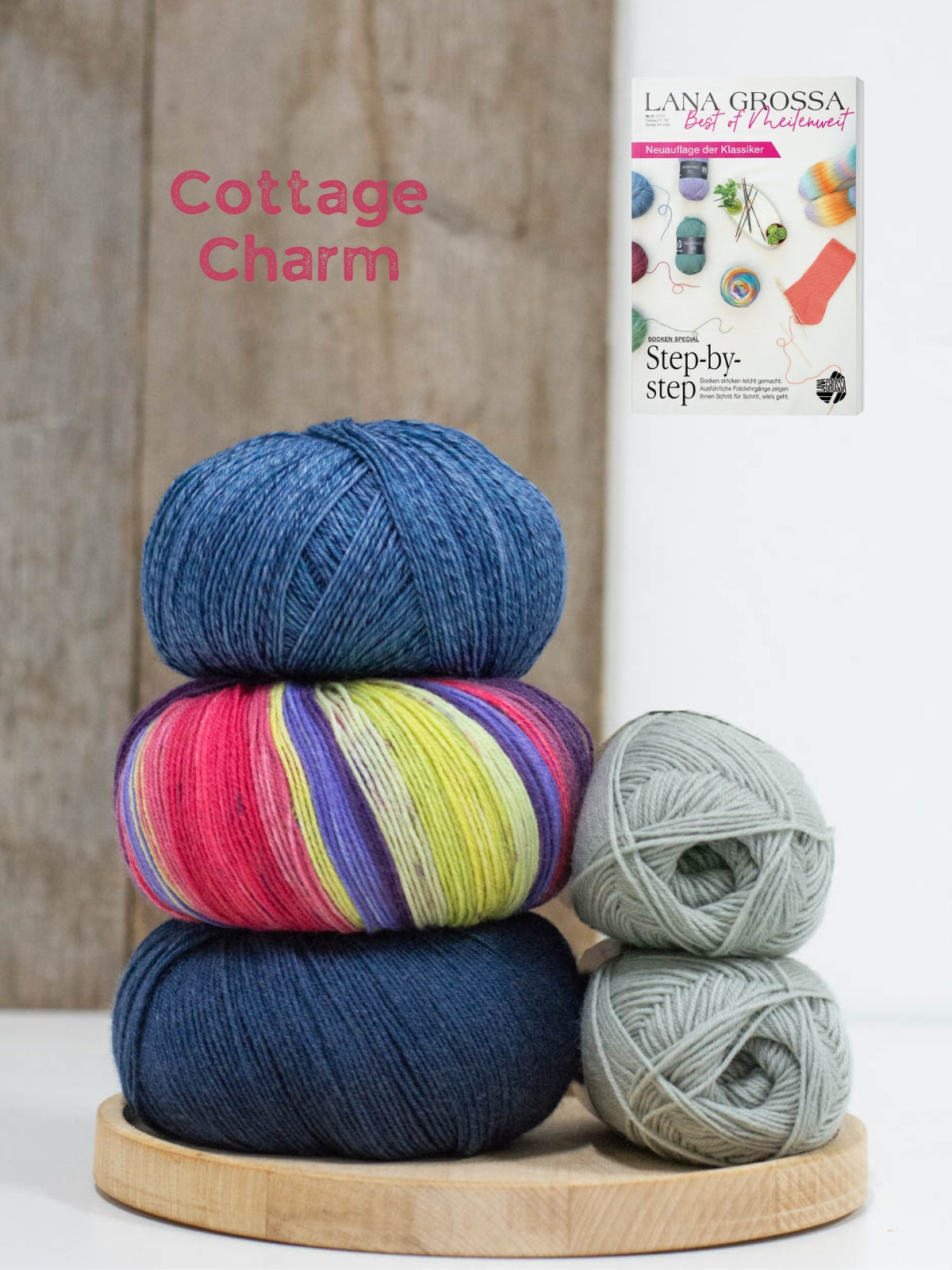 In diesem Paket finden Sie zwei Knäuel Meilenweit 50 Cashmere (70% Wolle, 25% Polyamid, 5% Kaschmir), ein Knäuel Meilenweit 100 Seta (55% Wolle, 25% Polyamid, 20% Seide), ein Knäuel Vintage Socks (75% Merinowolle, 25% Polyamid) und ein Knäuel Landlust die Sockenwolle (80% Merinowolle, 20% Polyamid). Damit können mehrere Modelle aus dem Magazin gestrickt werden!