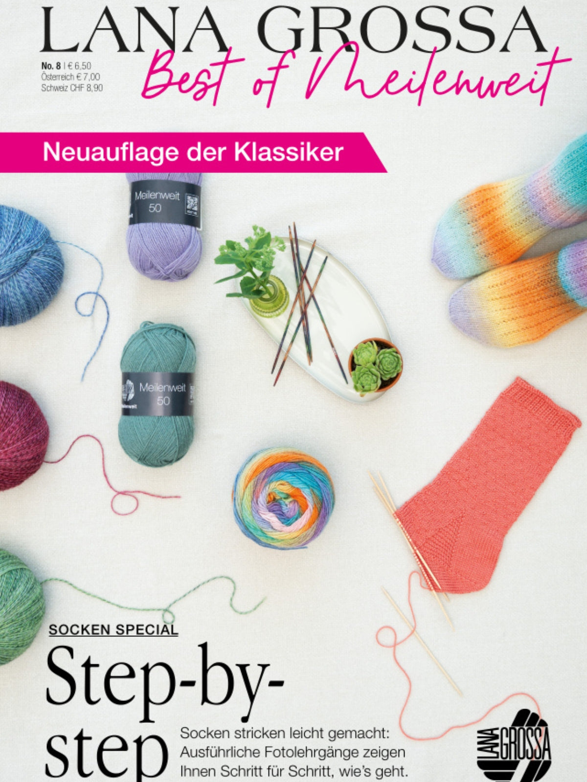 Das Paket besteht insgesamt aus 5 Knäuel Sockenwolle und dem Best of Meilenweit Magazin von Lana Grossa. Die benötigten Sockenstricknadeln (2 mm, 2,5 mm oder 3 mm) können Sie unten in Ihren Warenkorb legen.