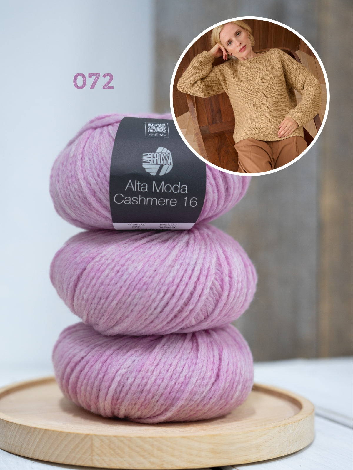 Material: Lana Grossa Alta Moda Cashmere 16 (78% Schurwolle (Merino), 12% Kaschmir, 10% Polyamid, Lauflänge 110 m/ 50 g), 550 (600 – 650) g Camel (Fb. 81);