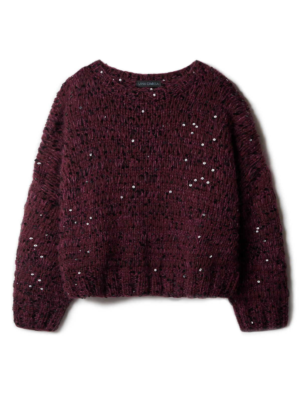 Material: Lana Grossa-Qualität „Alta Moda Cashmere 16“ (78 % Schurwolle (Merino), 12 % Kaschmir, 10 % Polya- mid, LL = ca 110 m/50 g): ca 350 (350 - 400 - 400) g Bur- gund (Fb 27); Lana Grossa-Qualität „Setasuri“ (69 % Alpa- ka (Suri), 31 % Seide, LL = ca 212 m/25 g): ca 75 (100 - 100 - 100) g Bordeaux (Fb 31); Lana Grossa-Qualität „Cosmo“ (100 % Baumwolle (plus Pailletten), LL = ca 260 m/100 g): 200 (200 - 300 - 300) g Schwarz (Fb 5);