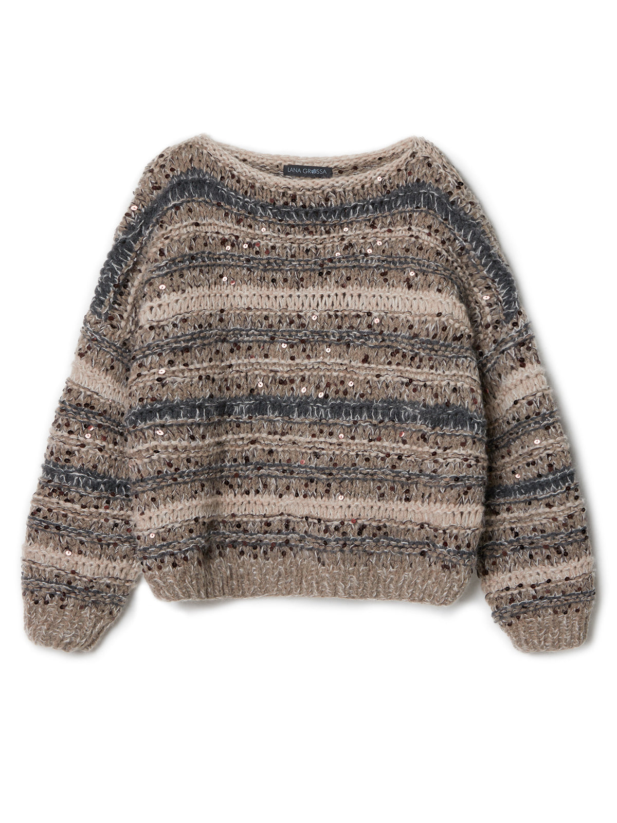 Dieser Pullover wird mit drei verschiedenen Garnen gleichzeitig gestrickt! Sie stricken unterschiedliche Streifen, bei denen nicht nur die Farben, sondern auch die Strukturen wechseln. Der Pullover wird in Teilen gestrickt, am Ende wird der Halsausschnitt mit einer Rundstricknadel angestrickt.