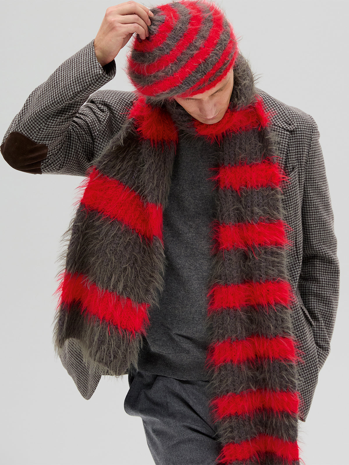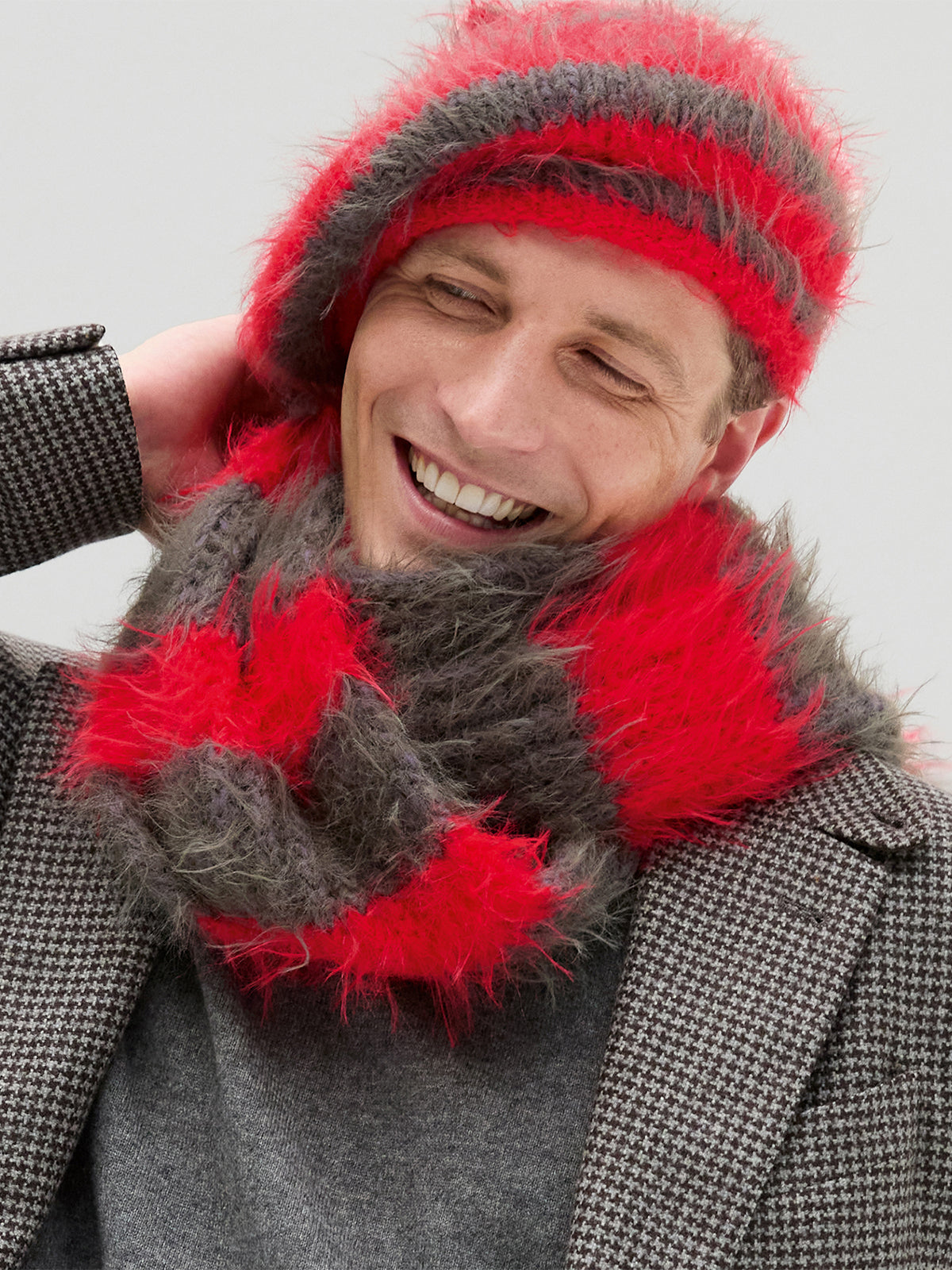 Schal: Lana Grossa „Basta“ (50% Schurwolle (Merino), 50% Polyamid LL = 100 m/50 g): 100 g Leuchtendrot (Fb 27) und 200 g Graubraun (Fb 34); Strick-Nd Nr 6
