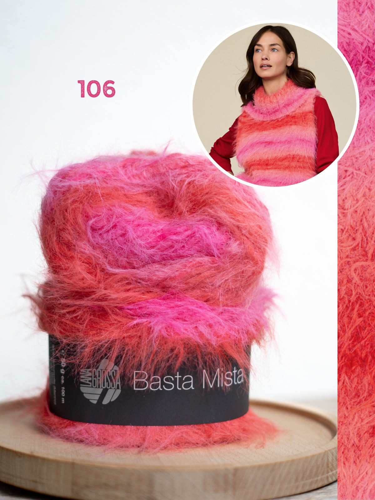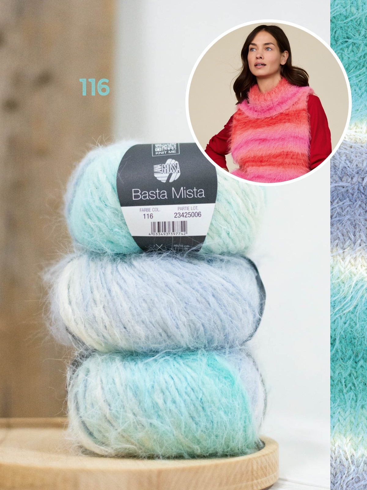 Das Strickpaket besteht aus 6/8/10 Knäueln Basta Mista und dem Lookbook 19 Magazin von Lana Grossa. Die benötigten Stricknadeln (5 mm, 6 mm, für den Hals kurze Nadeln 5 mm mit Seil 40 cm) können Sie direkt hier in Ihren Warenkorb legen.