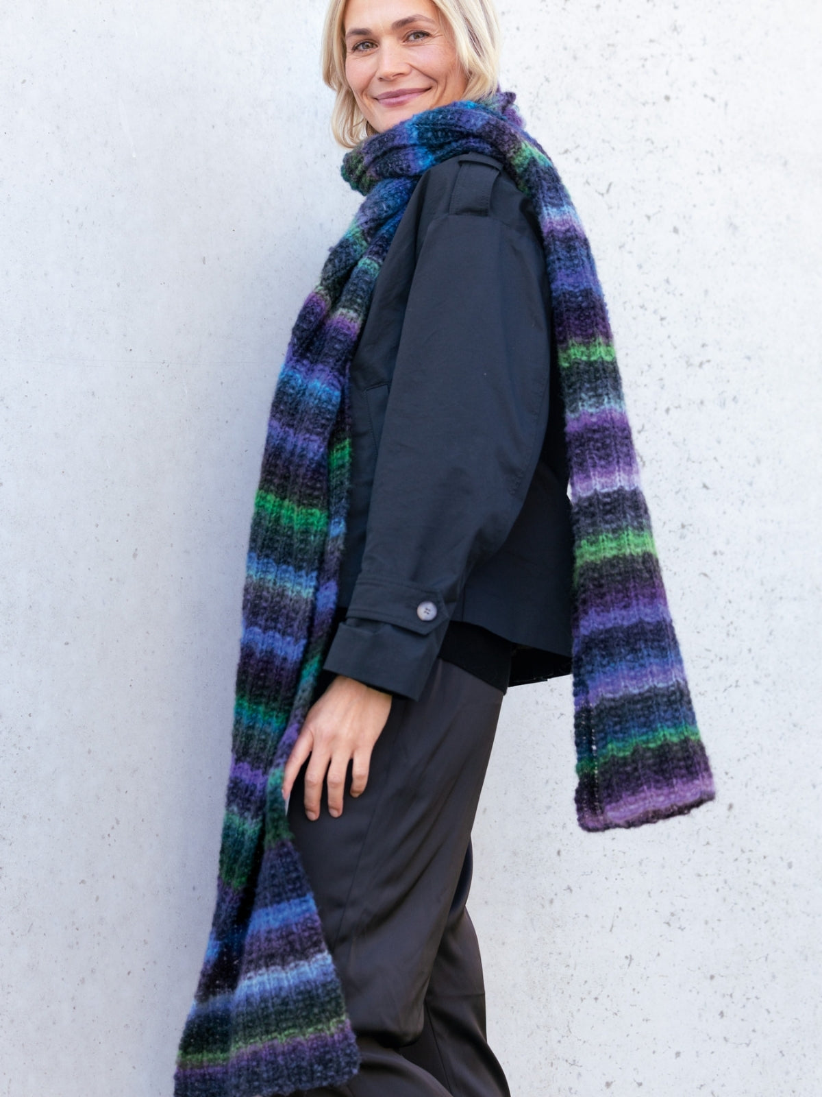 Bomba ist ein ideales Garn für kuschelige Schals! Dank des Flauschs und des schönen Farbverlaufs erhalten Sie nicht nur einen wunderbar warmen, sondern auch einen ganz besonderen Schal. Dieser Schal wird in falschem Patent gestrickt.