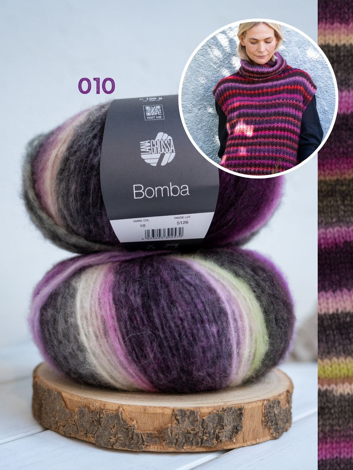 Das Strickpaket enthält die unten aufgeführten Garne sowie die Bomba Flyer von Lana Grossa. Die benötigten Nadeln können Sie gleich hier in Ihren Warenkorb legen.