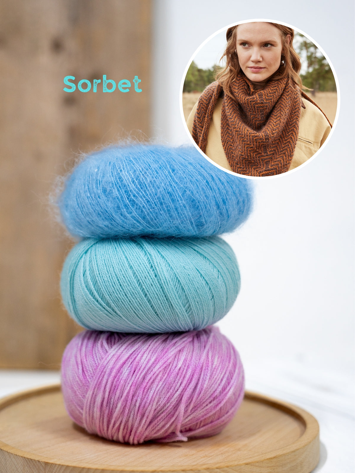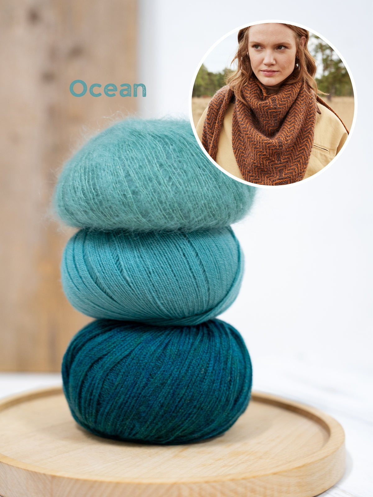 Dieses Tuch besticht durch ein grafisches Design, das im Mosaikmuster gestrickt wird. Cashmere 16 Fine wird dabei solo verstrickt, während für die Kontrastfarbe Cool Wool Lace zusammen mit Silkhair gehalten wird. So entsteht nicht nur ein spannender Farbkontrast, sondern auch ein wunderschöner Mix aus Texturen!