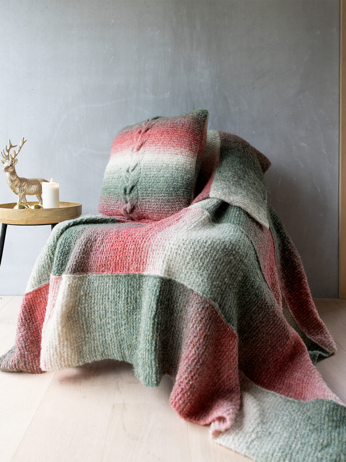 Material: Lana Grossa-Qualität Christmas Edition Gigante Lurex (70% Alpaka (Fine), 30% Polyamid, LL = ca 150 m/50 g): 150 g Rot/Grün/Weiß (Fb 999); Stricknadeln Nr 6; 1 Zopf- nadel; 1 waschbare Kissenfüllung 50 x 50 cm.
