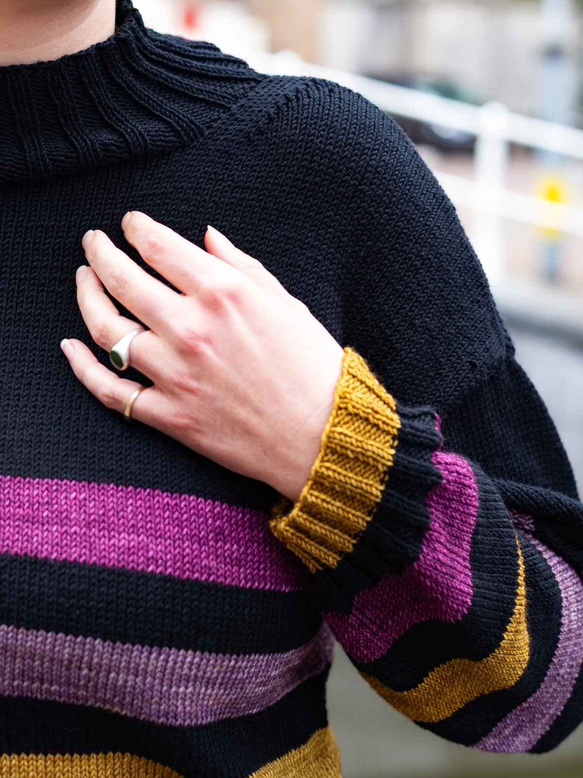 Dieser klassische Pullover mit breitem, rundem Halsausschnitt bekommt durch die farblich abgesetzten Streifen einen modernen Twist. Der Pullover wird mit Cool Wool gestrickt, die Streifen mit Cool Wool Vintage – das sorgt für schöne Farbkontraste.