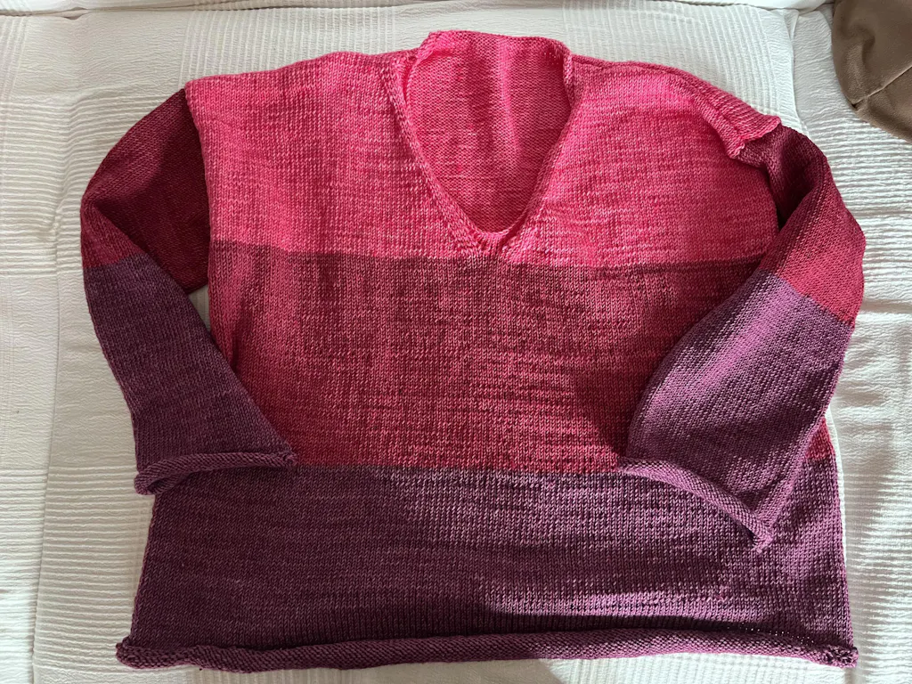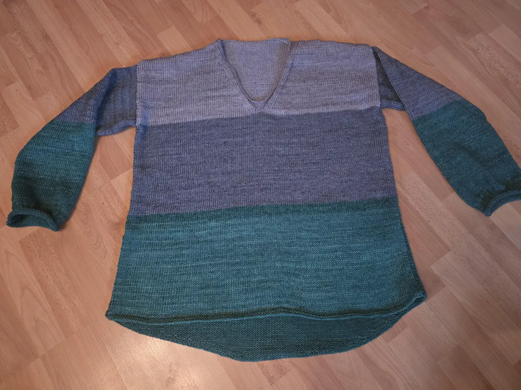 Nun habe ich meinen ersten Strickpulli fertiggestellt und er ist wunderschön geworden. Die Wolle lässt sich super verstricken, die Farbzusammenstellung ist einfach schön und der Pulli passt wunderbar. Die Anleitung ist gut erklärt, ich habe nur den Bund etwas verändert, traute mich noch nicht so recht mit dem Rollrand und den verschiedenlangen Vorder- und Rückteilen.