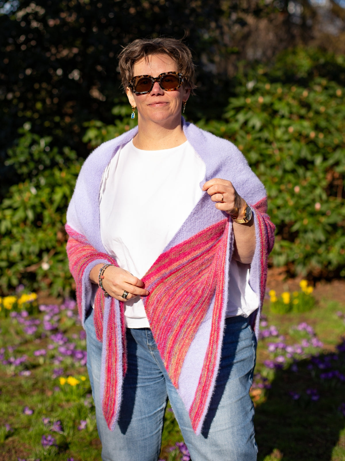 Dieses große Tuch wird mit einem unifarbenen Knäuel und einem selbststreifenden Knäuel gestrickt, was für einen lebendigen und verspielten Effekt sorgt.