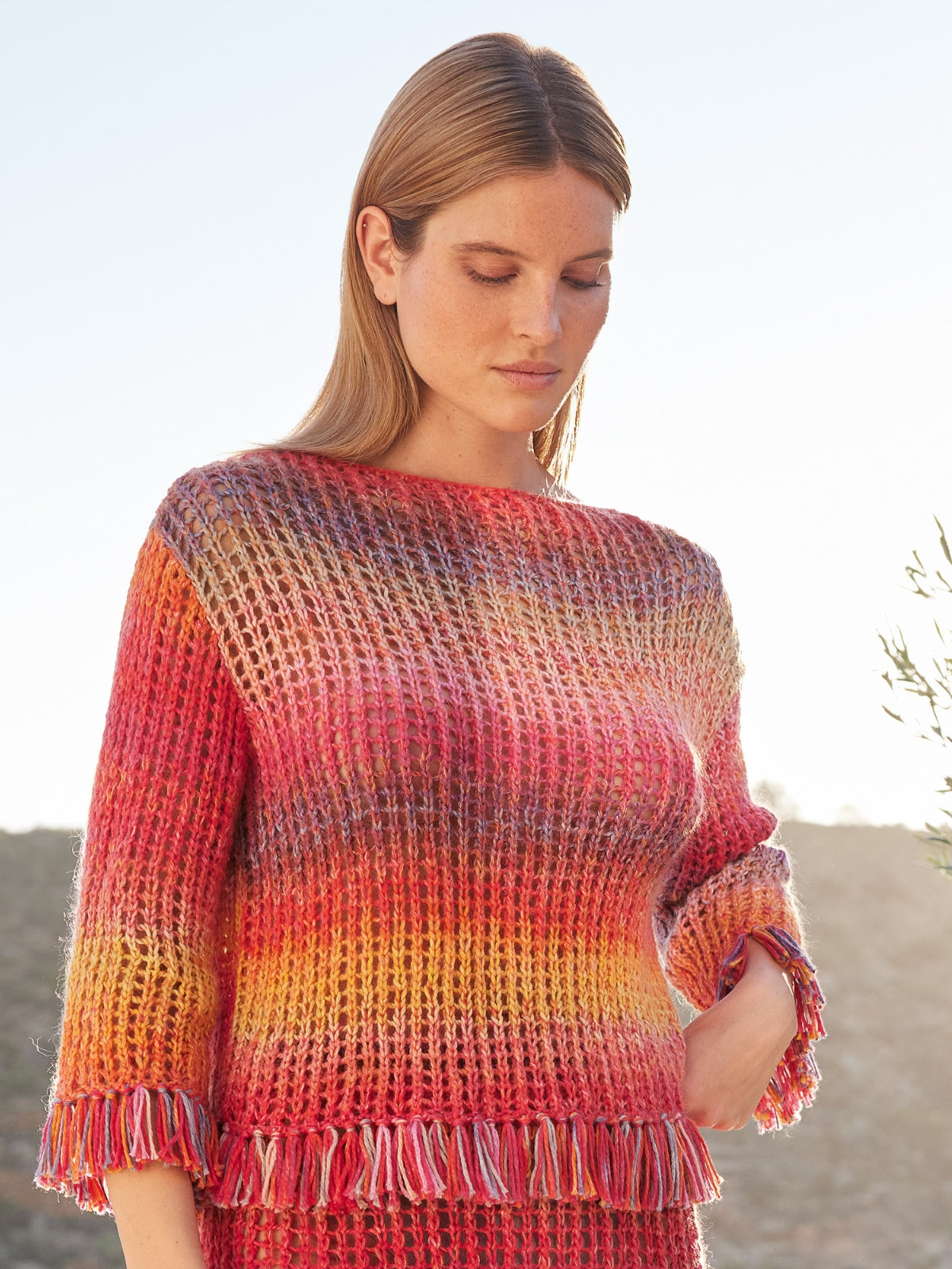 Dieser Pullover wird in einem einfachen Lochmuster mit zwei unterschiedlichen Verlaufsgarnen zusammen gestrickt, was für einen verspielten Farbeffekt sorgt. Der Pullover wird am unteren Rand mit Fransen abgeschlossen.