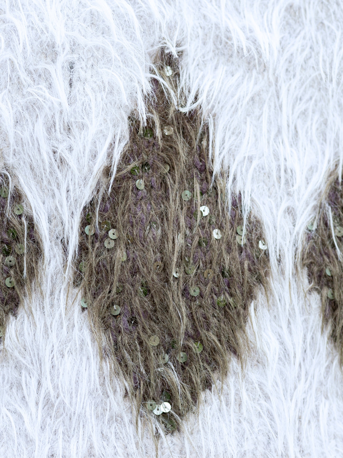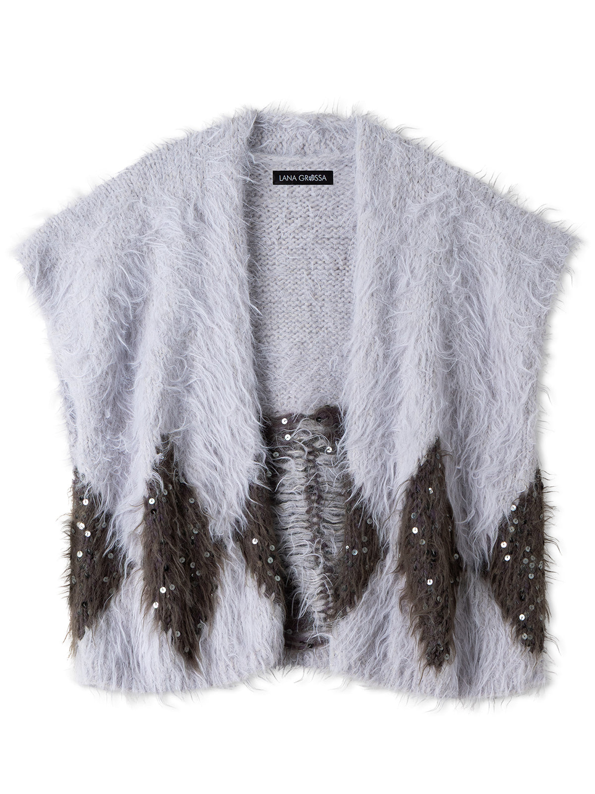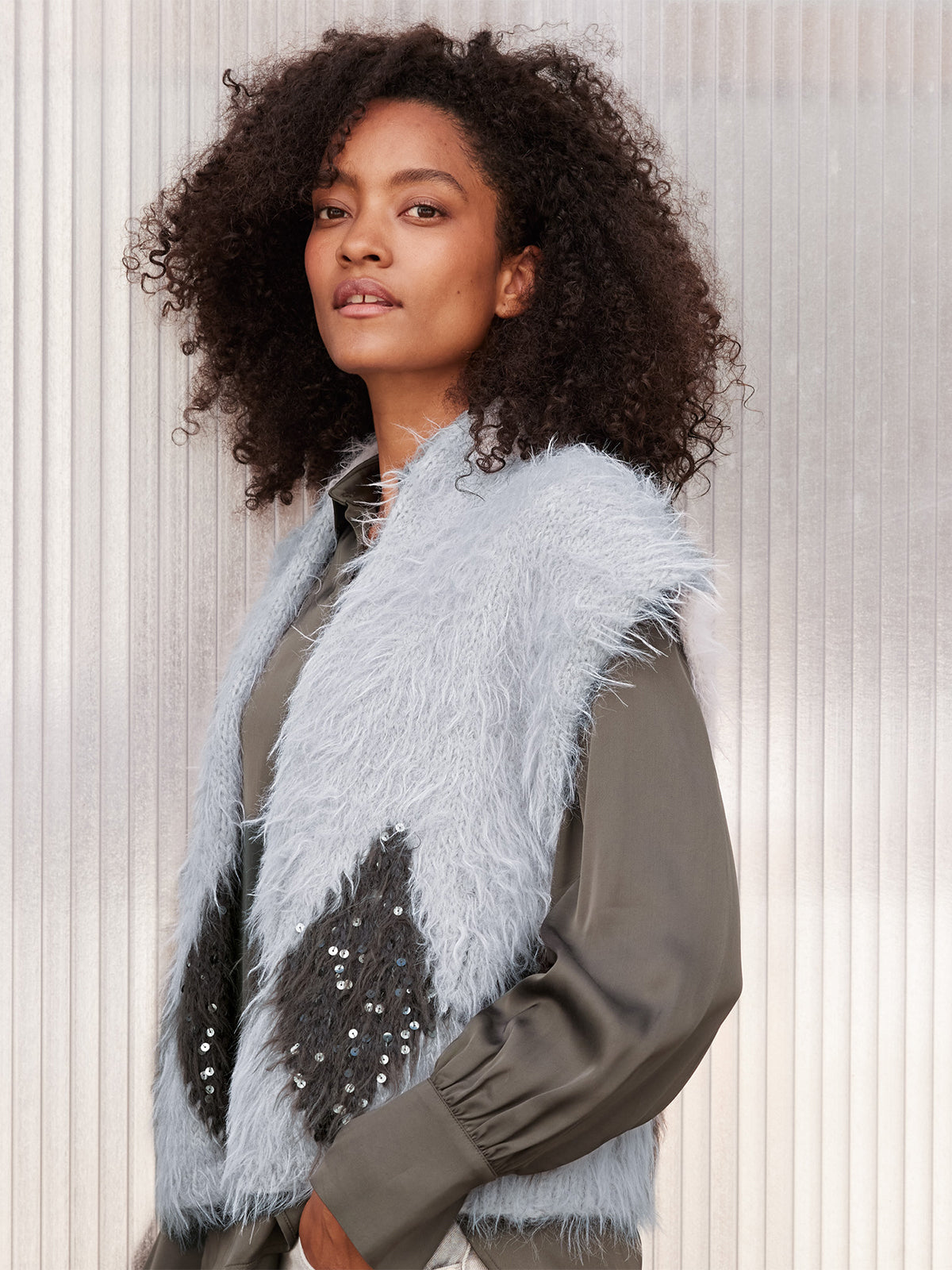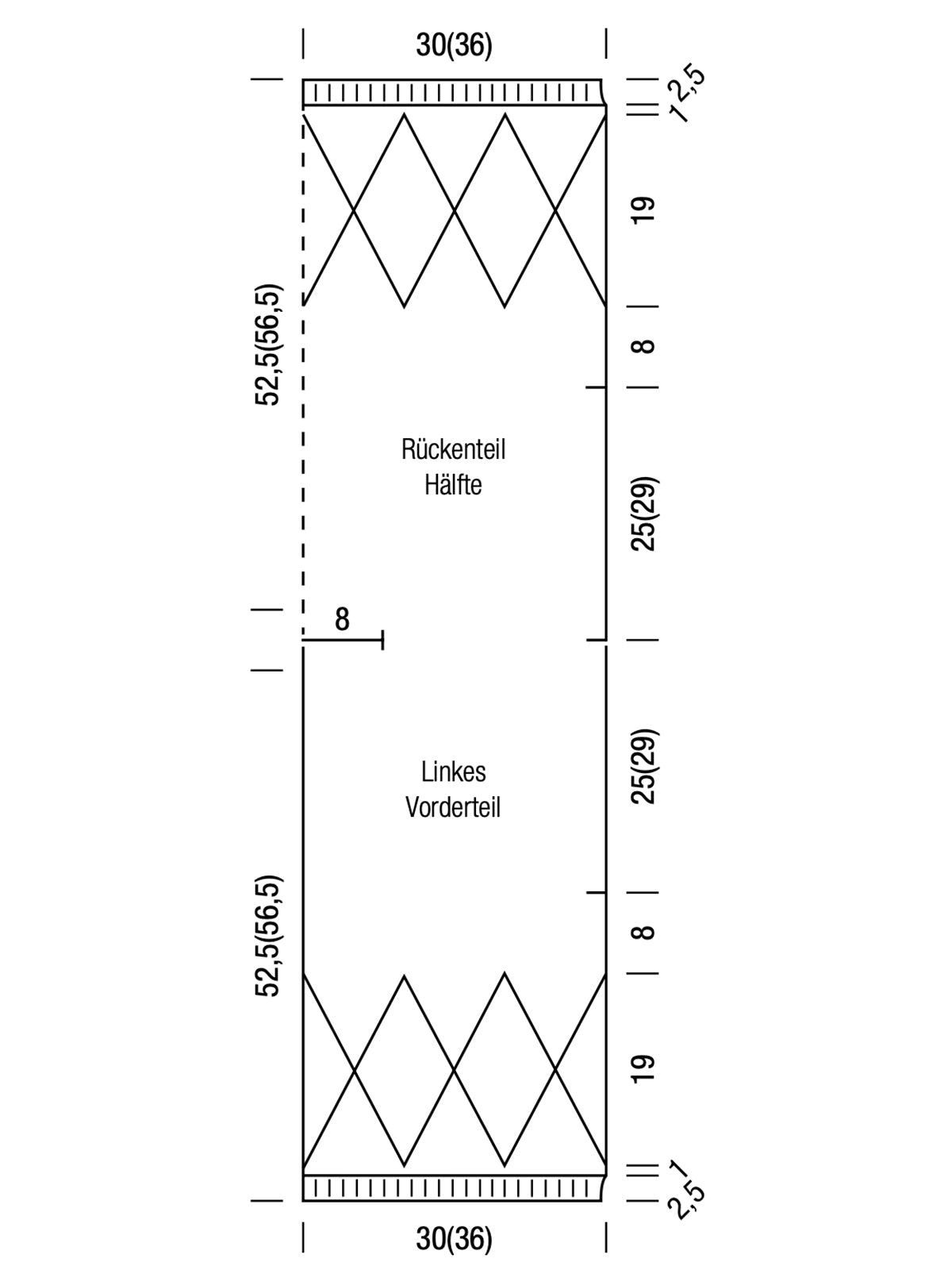 Dieser Weste ist nicht nur besonders gemütlich, sondern auch stilvoll mit eingestrickten Partien mit Pailletten! Die Farbe, die Sie gerade nicht verwenden, wird auf der Rückseite der Arbeit locker mitgeführt. Der Weste wird in 2 langen Teilen gestrickt, wobei Sie während des Strickens immer zwei Fäden zusammenhalten (Basta + Ecopuno oder Basta + Cosmo).