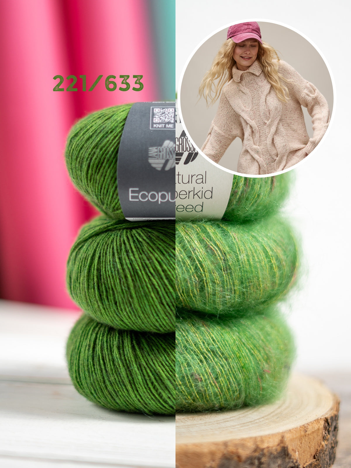 Material: Lana Grossa Ecopuno (72 % Baumwolle, 17 % Schurwolle (Merino), 11 % Alpaka (Baby), Lauflänge = 215 m/50 g): 650 (700 / 750 / 800) g Ecru (Fb. 46) und Lana Grossa Natural Superkid Tweed (60 % Mohair (Superkid), 30 % Seide, 7 % Baumwolle, 3 % Polyester, Lauflänge = 200 m/25 g): 175 (175 / 200 / 200) g Rosé (Fb. 629); je eine Rundstricknadel 5,5 mm und 6 mm, 80 – 100 cm lang; eine Rundstricknadel 5,5 mm, 40 cm lang (entfällt, wenn mit der Magic-Loop-Methode gestrickt wird), 1 Zopfnadel.
