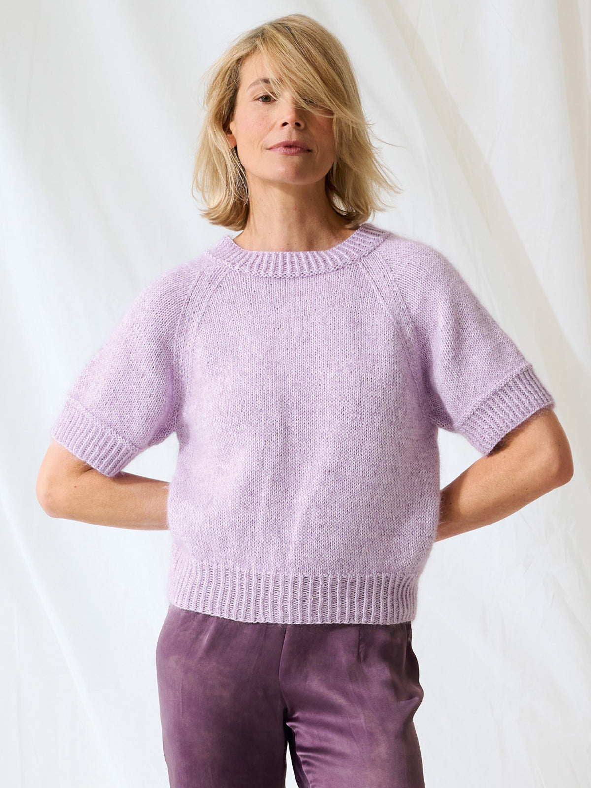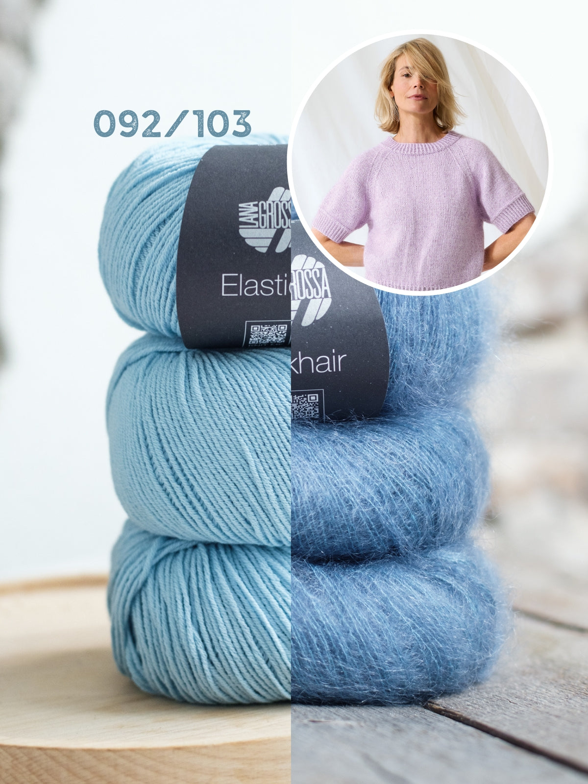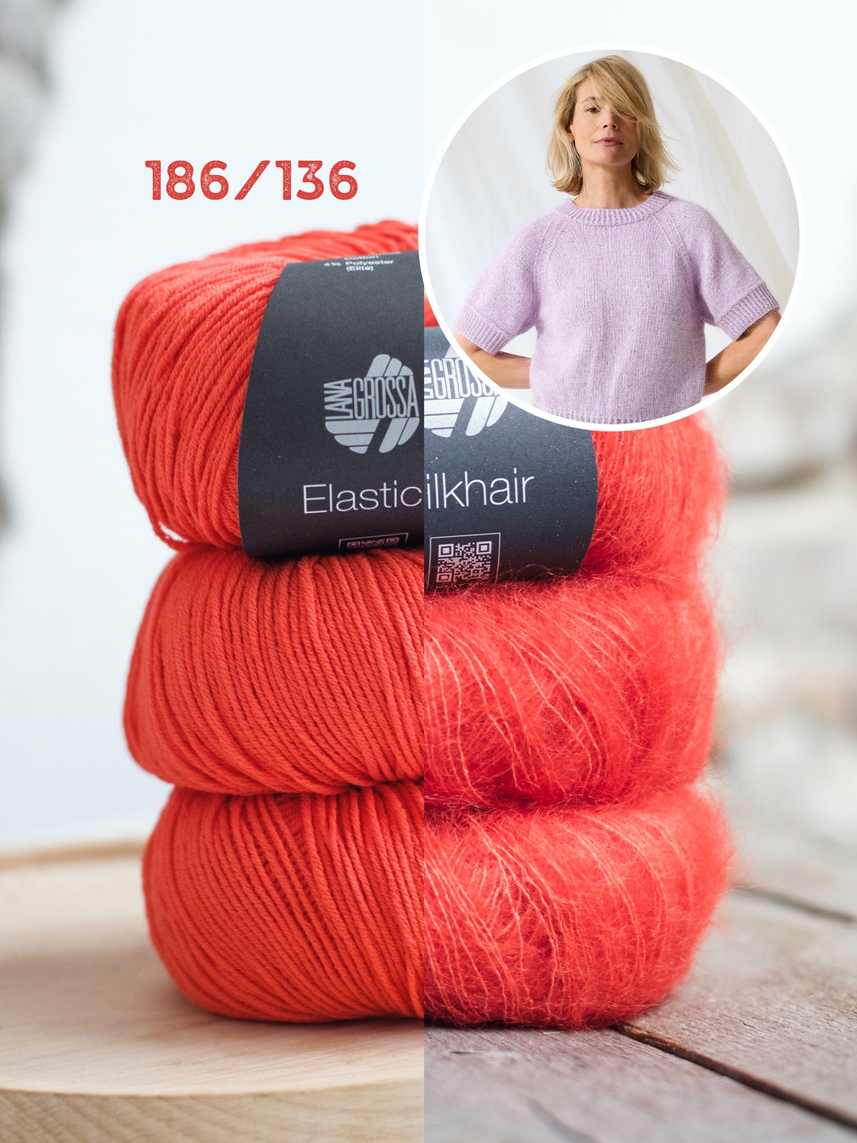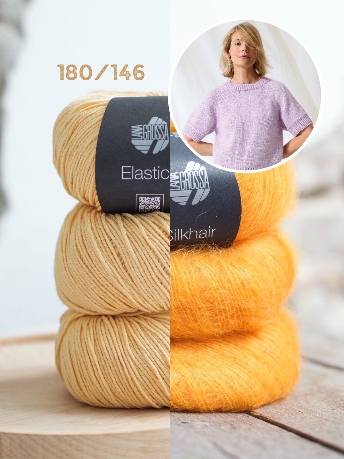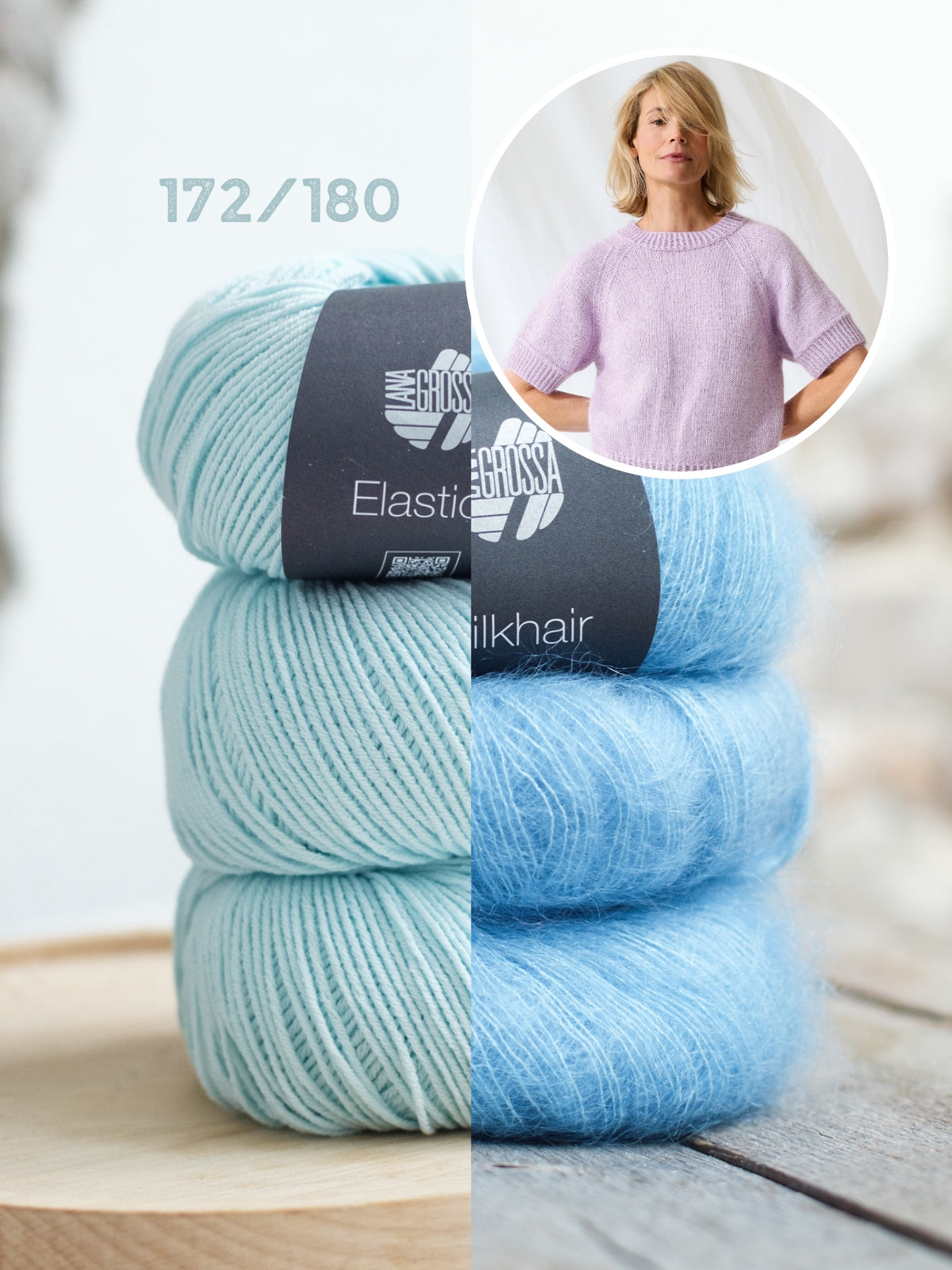 Der Pullover wird mit Elastico (96 % Baumwolle, 4 % Polyester) und Silkhair (70 % Superkid Mohair, 30 % Seide) gestrickt. Die Anleitung ist in den Größen 36 bis 48 ausgeschrieben.
