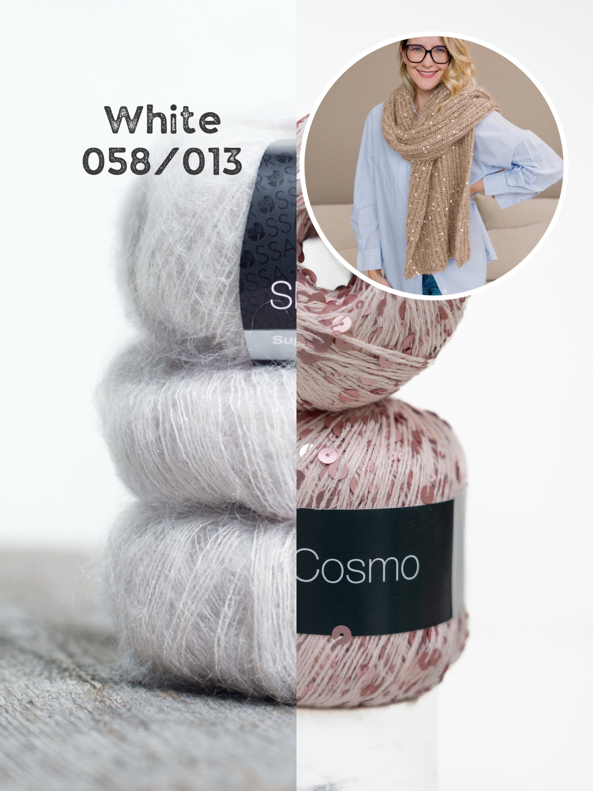 Das Paket besteht aus 6 Knäueln Silkhair in 1 oder 2 Farben, 2 Knäueln Cosmo und der digitalen Anleitung. Die benötigten Stricknadeln (6 mm) können Sie direkt hier in Ihren Warenkorb legen.