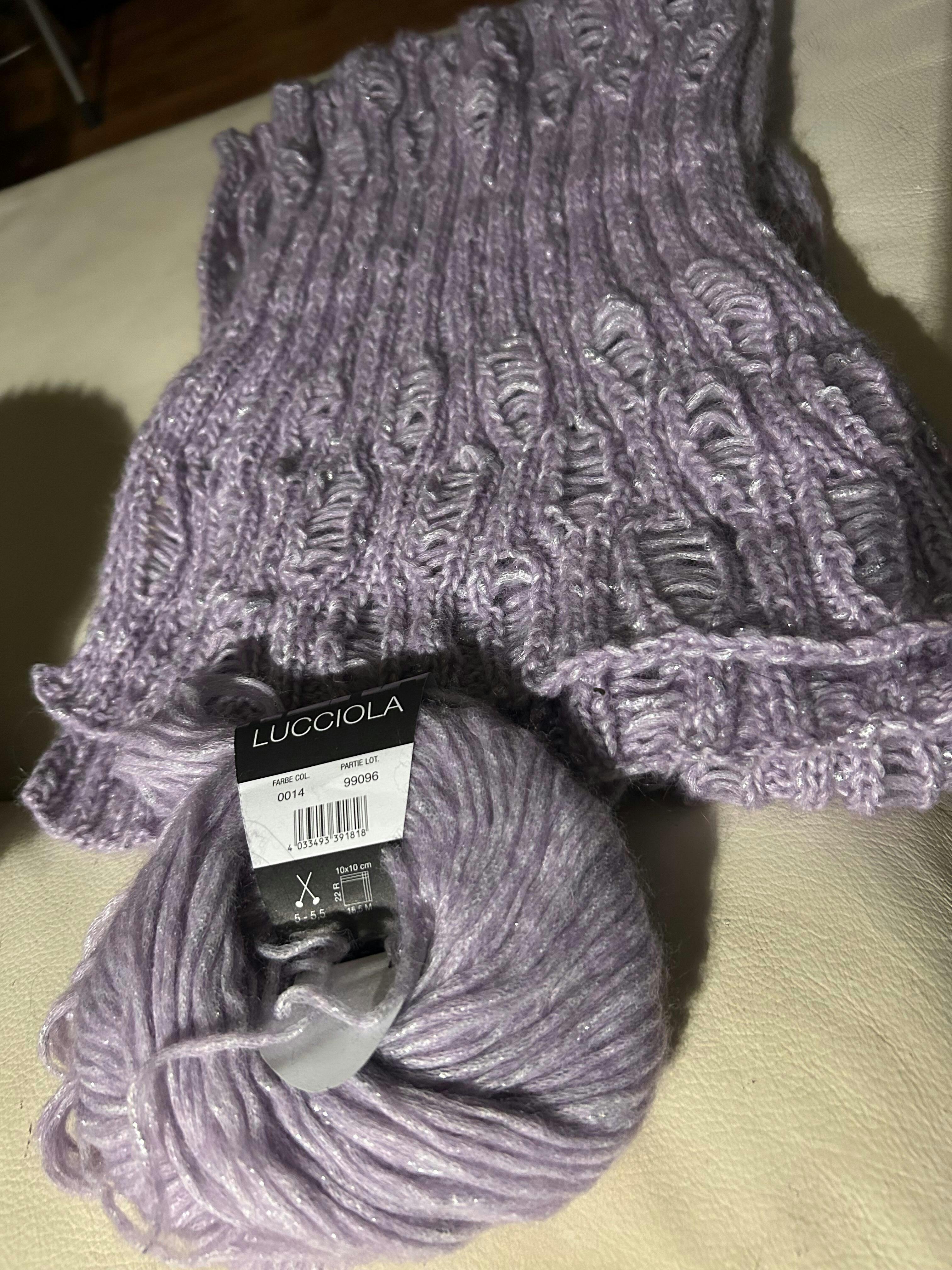Der Schal wird mit Lucciola gestrickt. Dieses Garn besteht aus 29 % Polyamid, 24 % Merinowolle, 22 % Viskose, 20 % Alpaka und 5 % metallisierten Fasern. Der Schal wird ca. 190 cm lang und 37 cm breit.