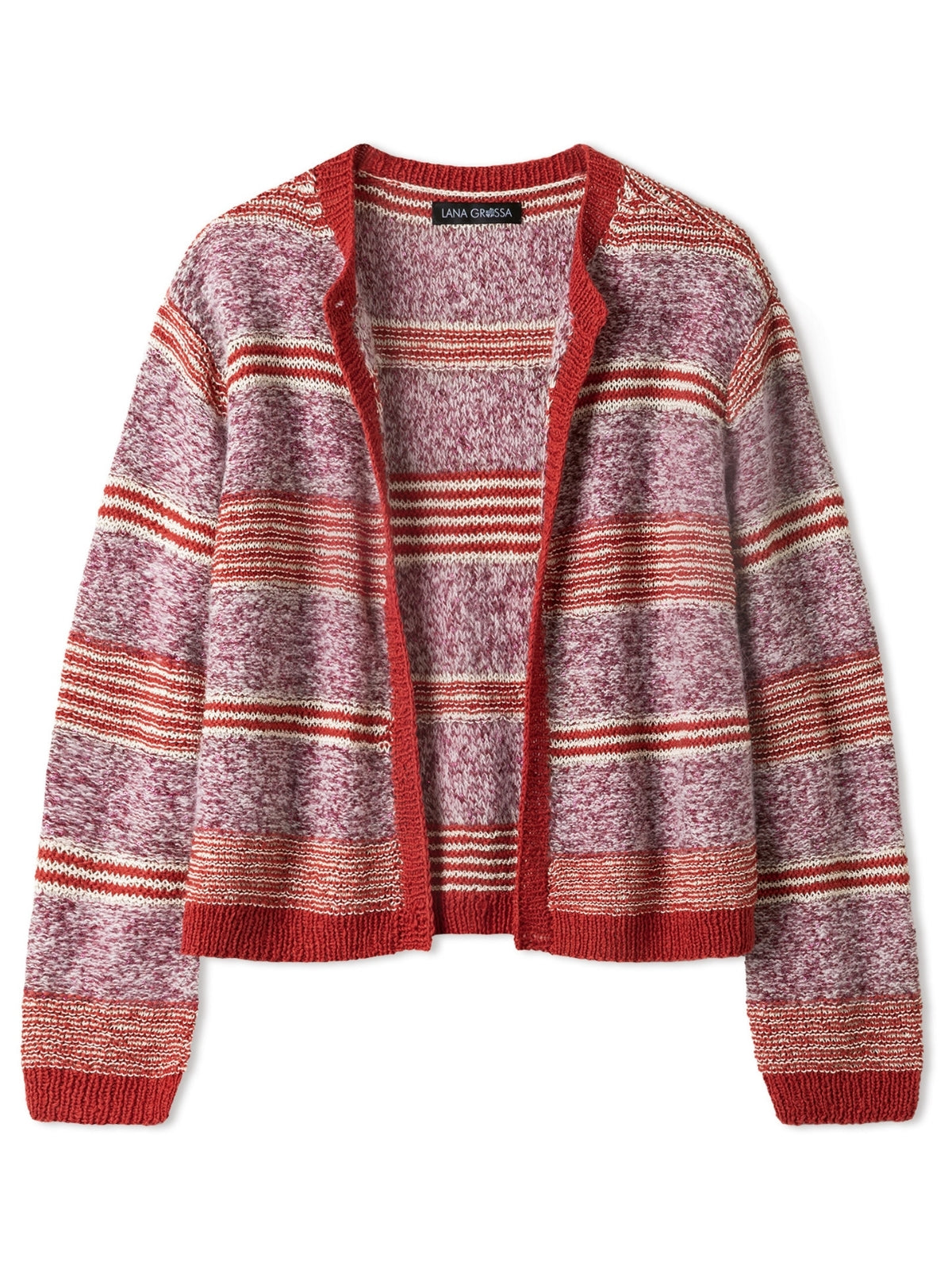 Material: Lana Grossa-Qualität „Summer Cashmere“ (90 % Baumwolle, 10 % Kaschmir, LL = ca 210 m/50 g): ca 100 (150 - 150 - 200) g Orientrot (Fb 25); Lana Grossa-Qualität „Setasuri“ (69 % Alpaka (Suri), 31 % Seide, LL = ca 212 m/25 g): ca 75 (100 - 100 - 125) g Creme (Fb 2); Lana Grossa-Qualität „Filo Lurex“ (94 % Baumwolle, 6 % Polyester, LL = ca 145 m/50 g): ca 100 (100 - 150 - 150) g Creme (Fb 2); Lana Grossa-Qualität „Glamour“ (55 % Polyamid, 45 % Polyester, LL = ca 115 m/25 g): ca 125 (125 - 150 - 150) g Bordeaux (Fb 9); Stricknadeln Nr 3 und Nr 4; 1 Rundstricknadel Nr 3