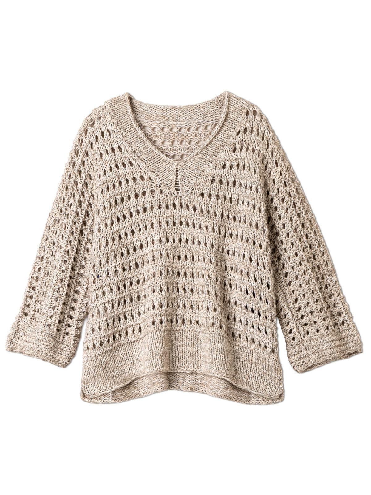 Dieser Pullover wird in einem Ajourmuster gestrickt und hat Dreiviertelärmel sowie einen V Ausschnitt. Beim Stricken werden zwei unterschiedliche Garne zusammen gehalten.