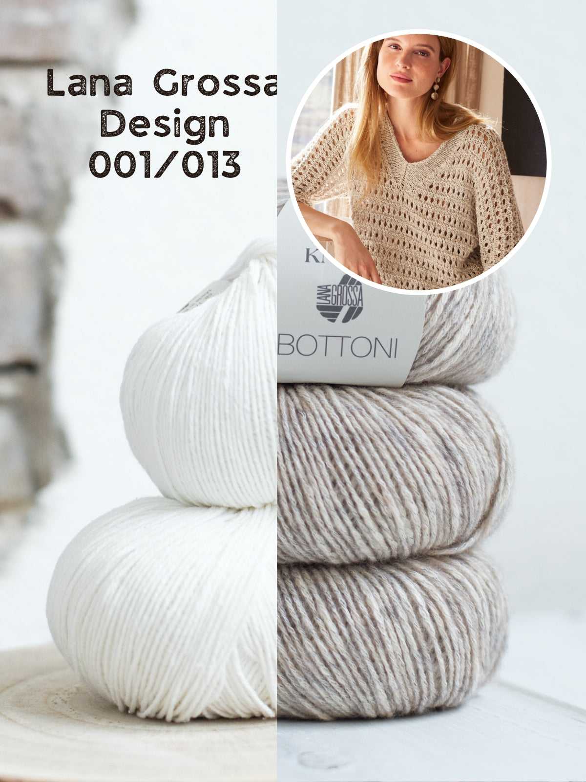 Material: Lana Grossa Bottoni (53% Baumwolle, 24% Viskose, 23% Schurwolle (Merino extrafein), LL = ca. 125 m/50 g), 300 (350 – 400) g Graubeige/Creme (Fb 13) und Lana Grossa Landlust Sommerseide (50% Seide, 50% Baumwolle, LL = ca. 170 m/50 g), 250 (250 – 300) g Weiß (Fb 1). Stricknd Nr. 6 und Nr. 7 sowie eine 60 cm lange Rundstricknd Nr. 6; 1 Häkelnd Nr. 4,5. 3 Hilfsnd zum M stilllegen. Hinweis: Stets 2 fädig mit 1 Faden Bottoni und 1 Faden Landlust Sommerseide arb!