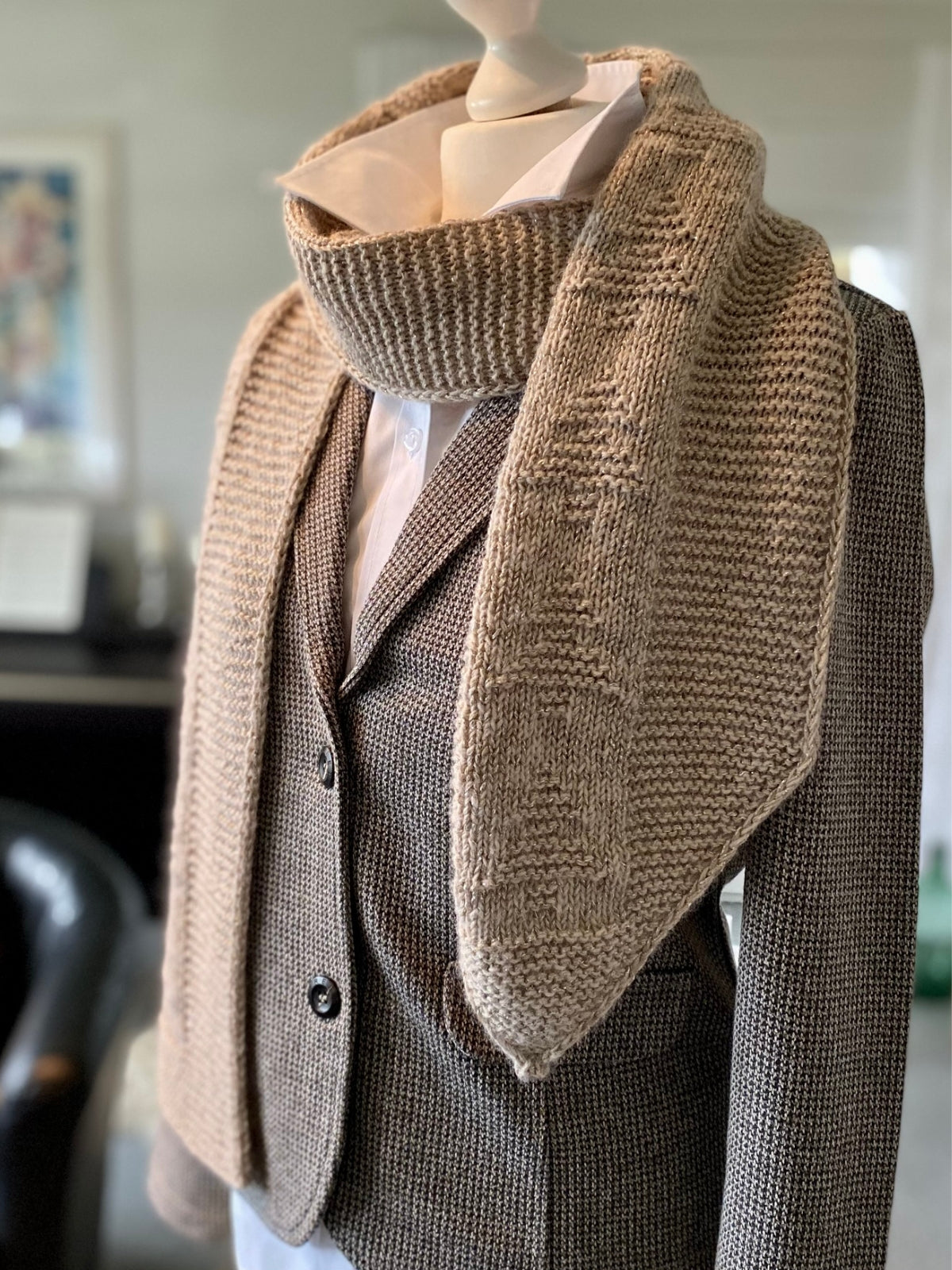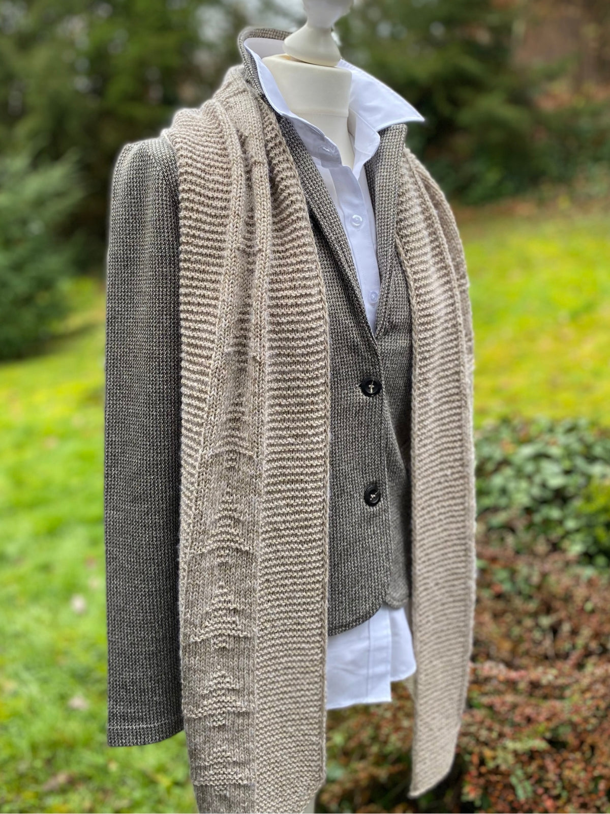 Der Schal wird mit Ecopuno (72% Baumwolle, 17% Wolle, 11% Alpaka) und Brillino (83% Viskose, 17% Lurex) gestrickt. Der Schal misst nach dem Spannen ca. 182 x 24,5 cm.