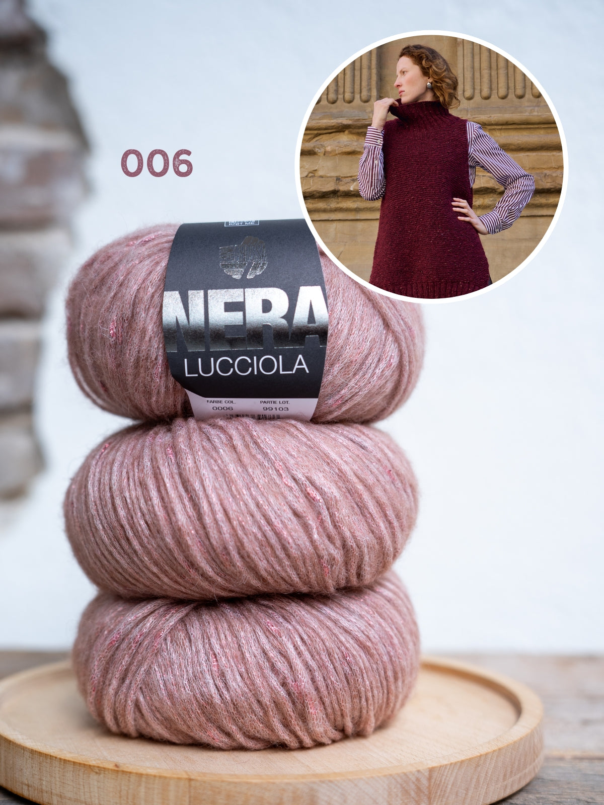 Material: Lana Grossa-Qualität „Lucciola“ (29 % Polyamid, 24 % Schurwolle (Merino Fine), 22 % Viskose, 20 % Alpaka (Baby), 5 % Metallische Faser, LL = ca 130 m/50 g): ca 350 (400 - 450 - 500) g Schwarzrot (Fb 11);