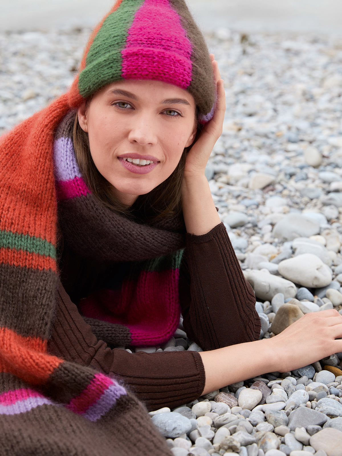 Material: Lana Grossa „Mohair di Gio“ (55% Mohair (Superkid), 45% Schurwolle (Merino superfine), LL = 85 m/50 g): 150 g Graubraun (Fb 7), 100 g Orangerot (Fb 6), je 50 g Fliederlila (Fb 1), Pink (Fb 3) und Resedagrün (Fb 13), Lana Grossa „Glamour“ (55% Polyamid, 45% Polyester, LL = 115 m/25 g): 50 g Graulila (Fb 2); Strick-Nd Nr 7.