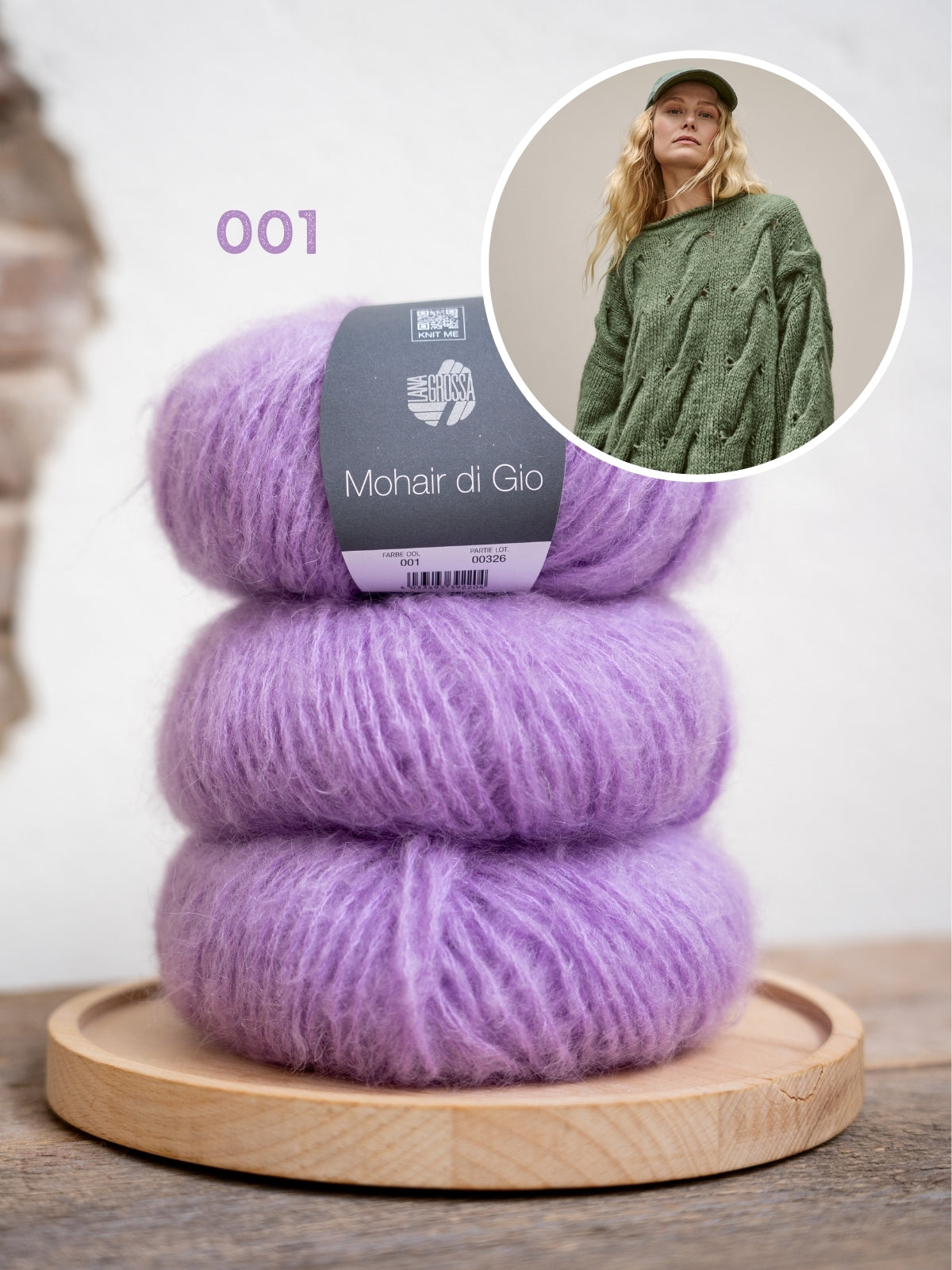 Material: Lana Grossa Mohair di Gio (55 % Mohair (Superkid), 45 % Schurwolle (Merino superfine), Lauflänge = 85 m/50 g): 600 (650 / 700 / 750) g Resedagrün (Fb. 13); je eine Rundstricknadel 6 mm und 7 mm, 80 – 100 cm lang, eine Rundstricknadel 6 mm, 40 cm lang (entfällt, wenn mit der Magic-Loop-Methode gestrickt wird), 1 Zopfnadel.